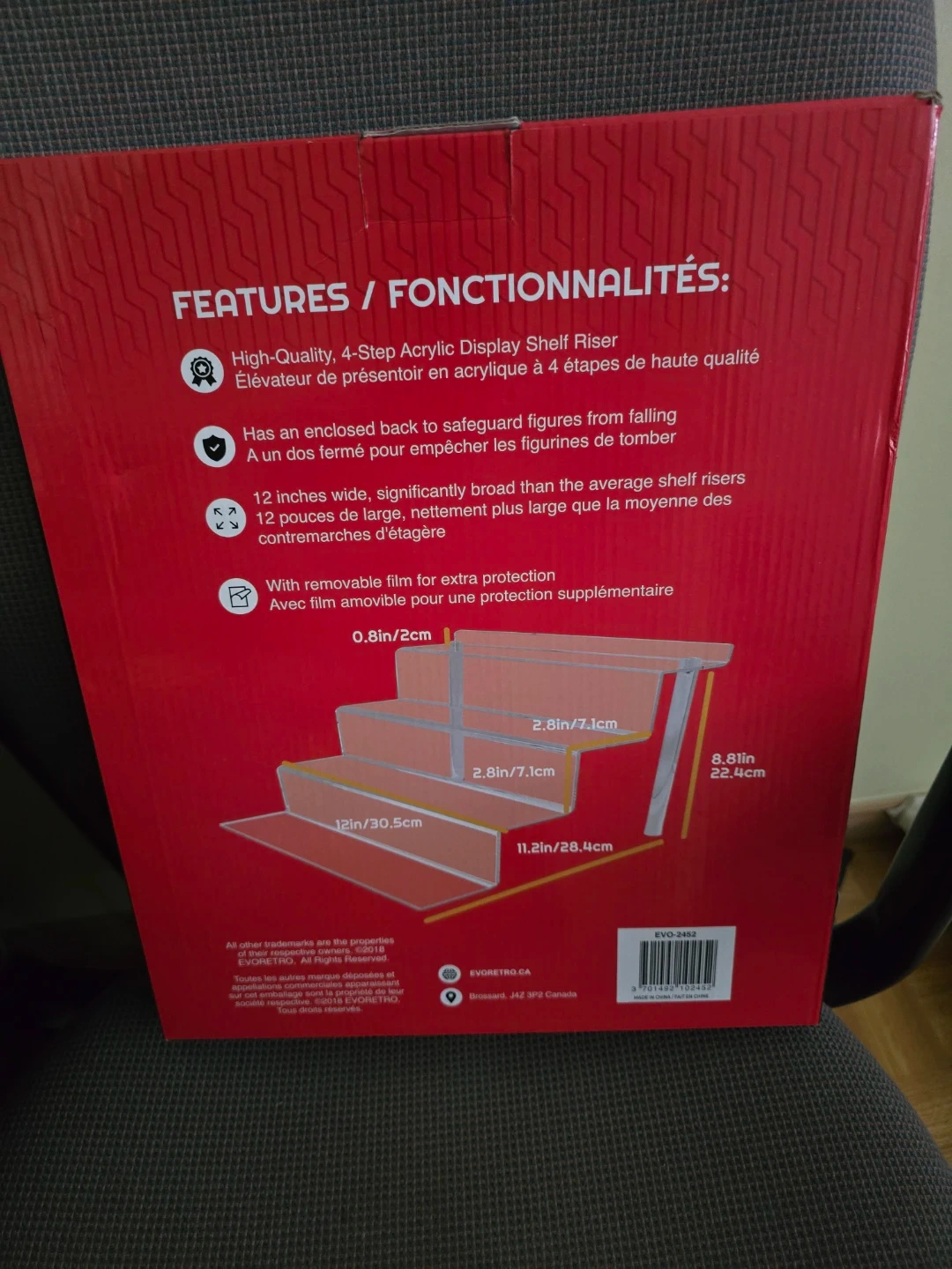 This is a 2-pack of EVORETRO 4-step acrylic display shelf risers. They're designed with an enclosed back to stop figures from falling. Includes a screwdriver and cleaning cloth for setup. The risers are 12 inches wide and come with a removable protective film.