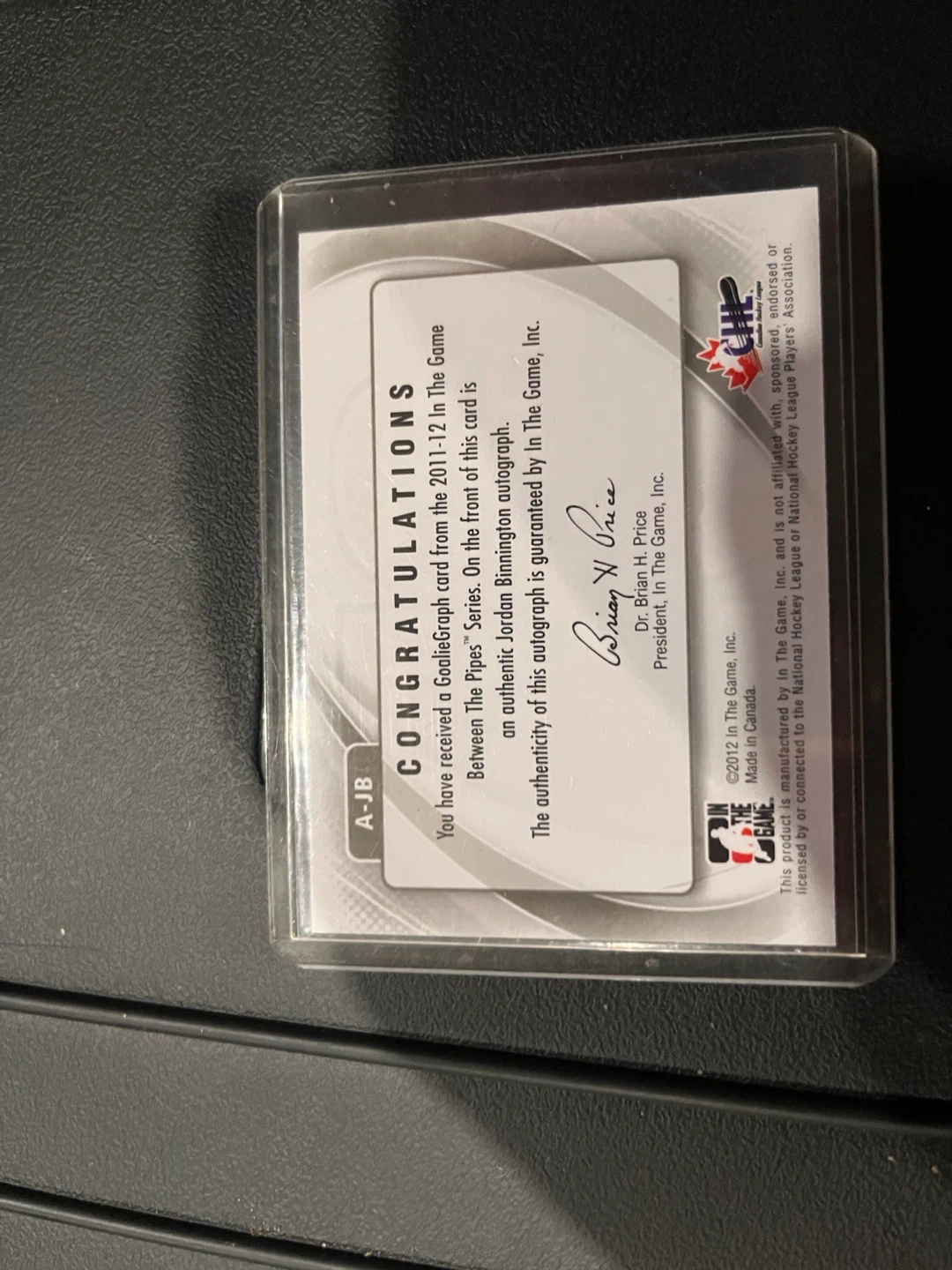 Authentic autographed Jordan Binnington card from the 2011-12 "Between the Pipes" Series. This "Future Stars" card is guaranteed authentic by The Game, Inc. It's a Gobie Graph card.
