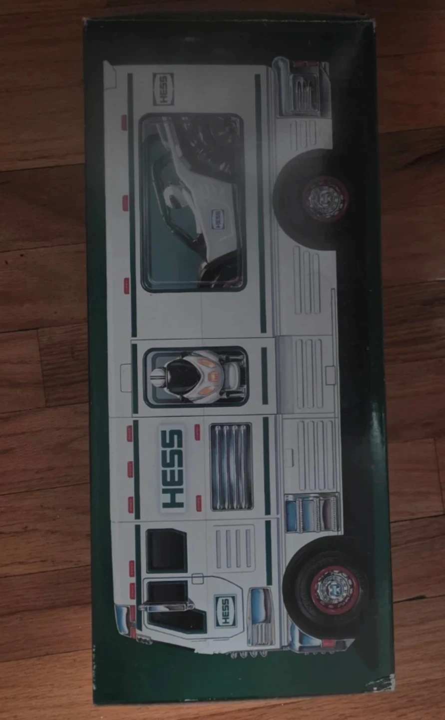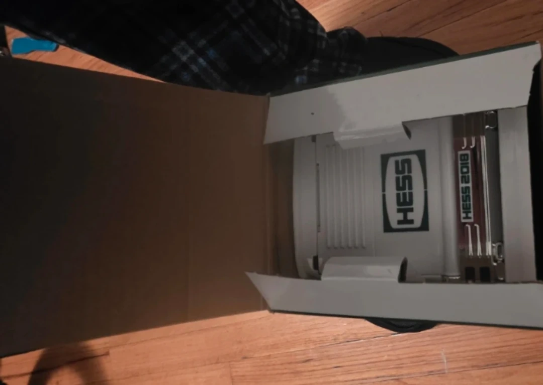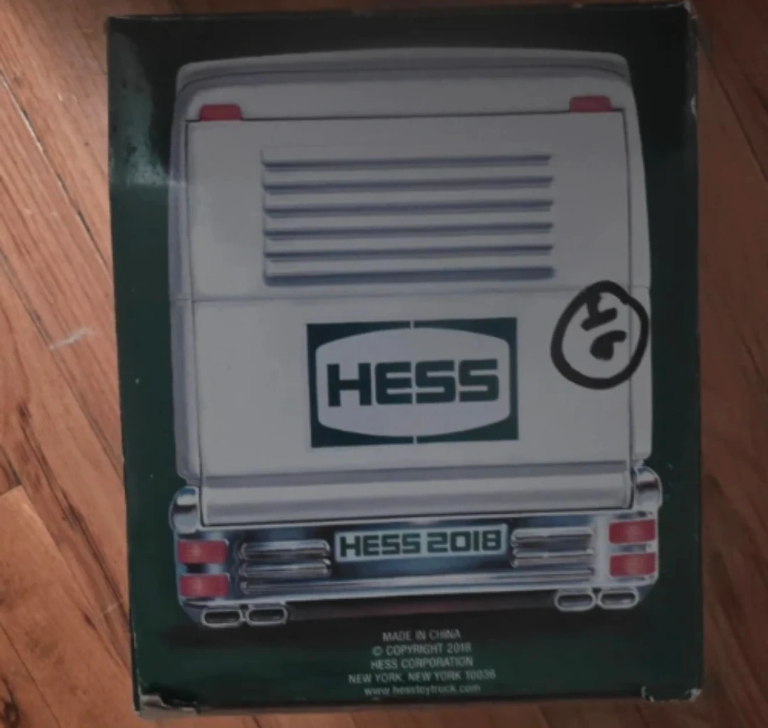 This is the 2018 Hess RV toy truck and motor home with trailer. It's made of plastic and features lights and sounds. The trailer opens with three buttons to reveal the RV inside. Includes the original box.