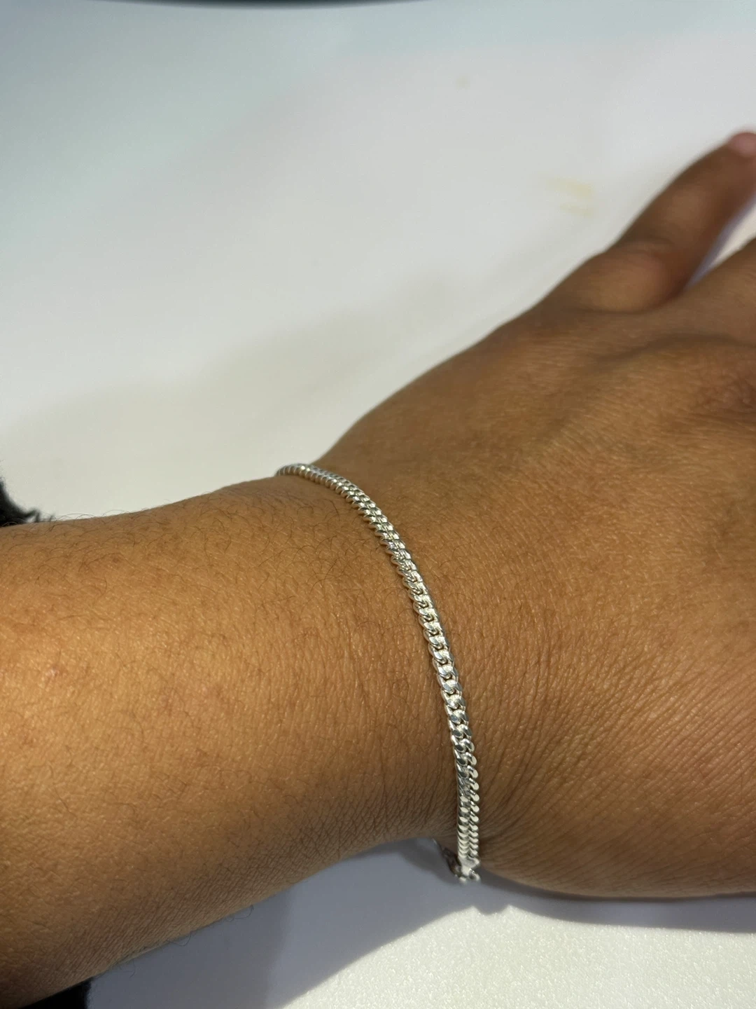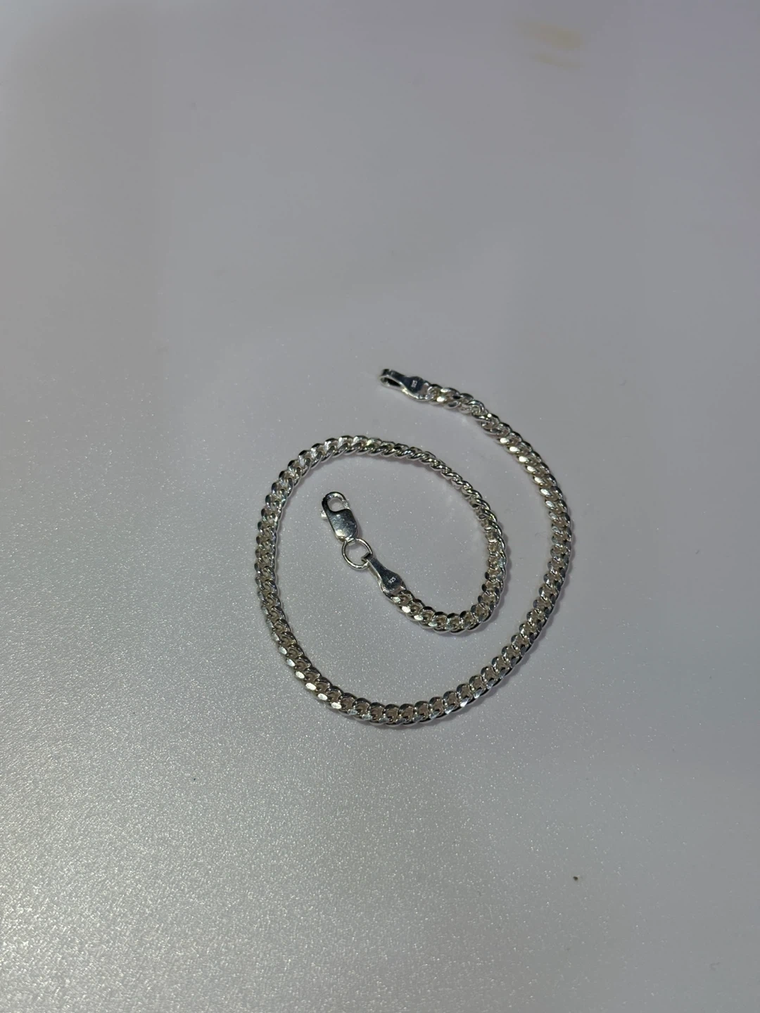 Shiny sterling silver curb chain anklet. It's approximately 9-10 inches long with a secure clasp. This anklet's simple design makes it suitable for everyday wear. It's a nice addition to any jewelry collection!