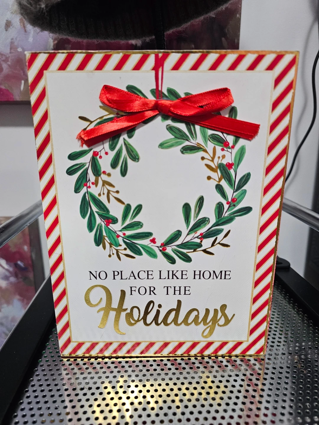 This wooden box is perfect for holiday decor. It reads "NO PLACE LIKE HOME FOR THE Holidays" with a festive wreath and red ribbon. It can be standalone decoration.