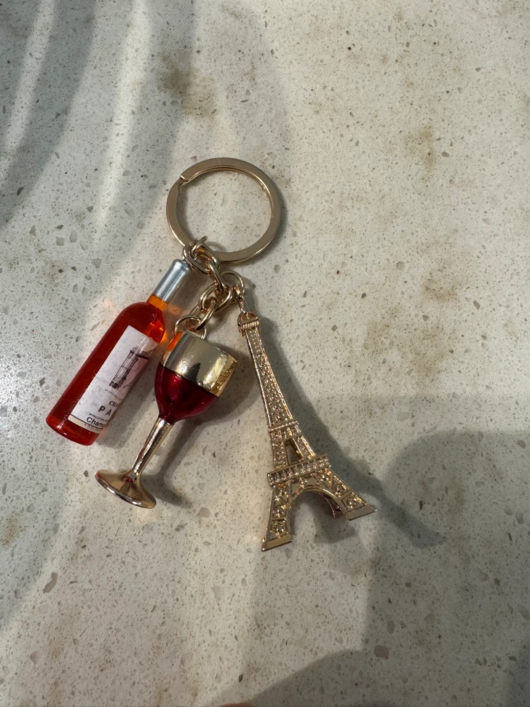 A charming keychain featuring a miniature Eiffel Tower, a wine glass with red liquid, and a small bottle of wine labelled 'Chateau Paris'. It's a fun accessory for anyone who loves Paris or wine!