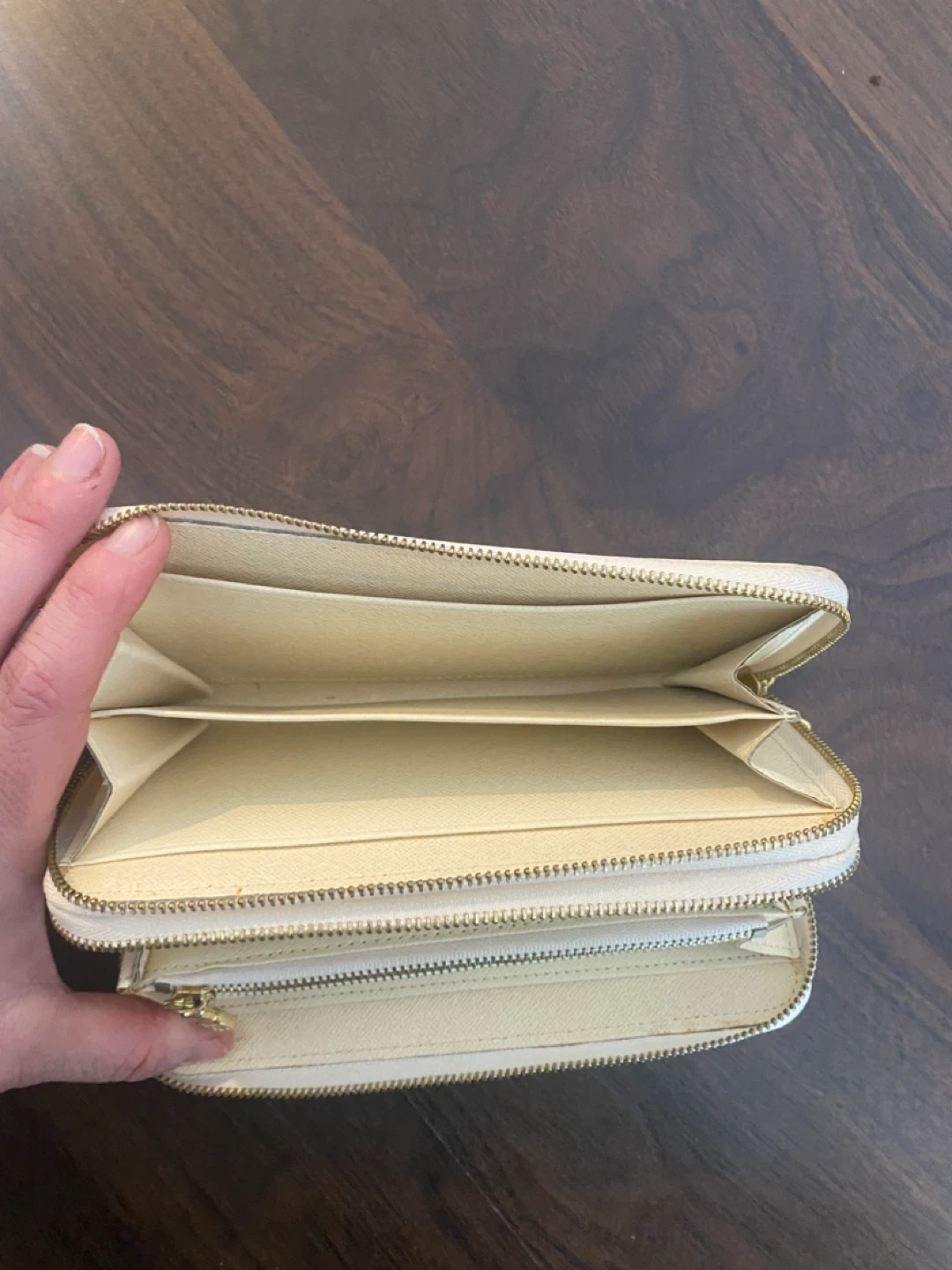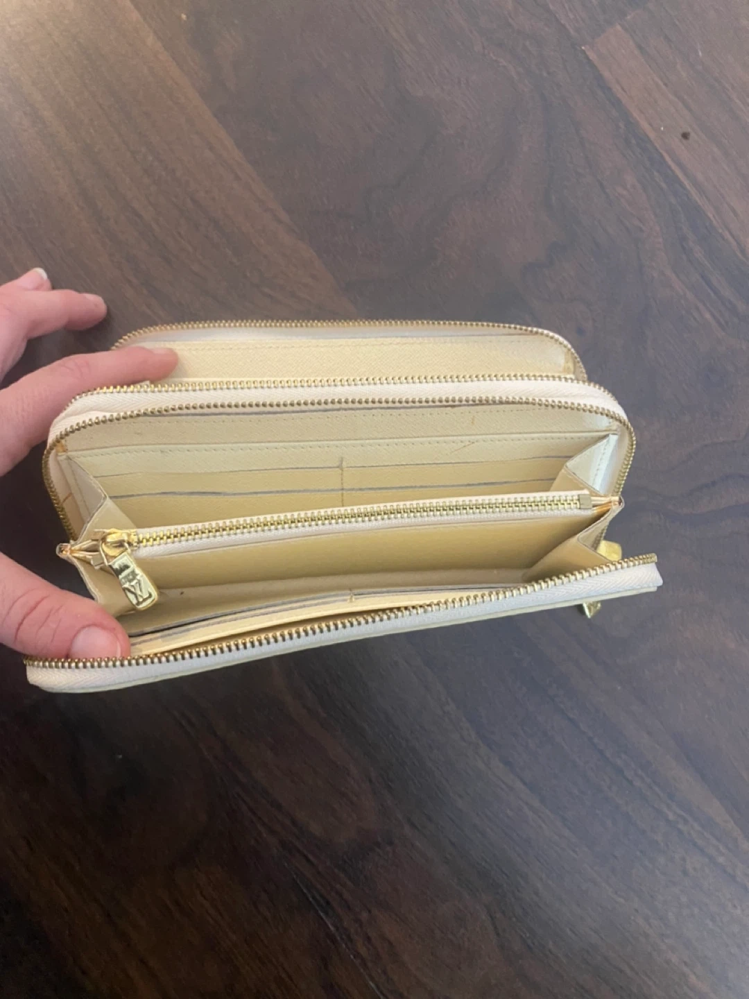 This Louis Vuitton Zippy wallet comes in the Damier Azur pattern. It's a zip-around style with multiple card slots and compartments inside. Gold-tone hardware completes the look.