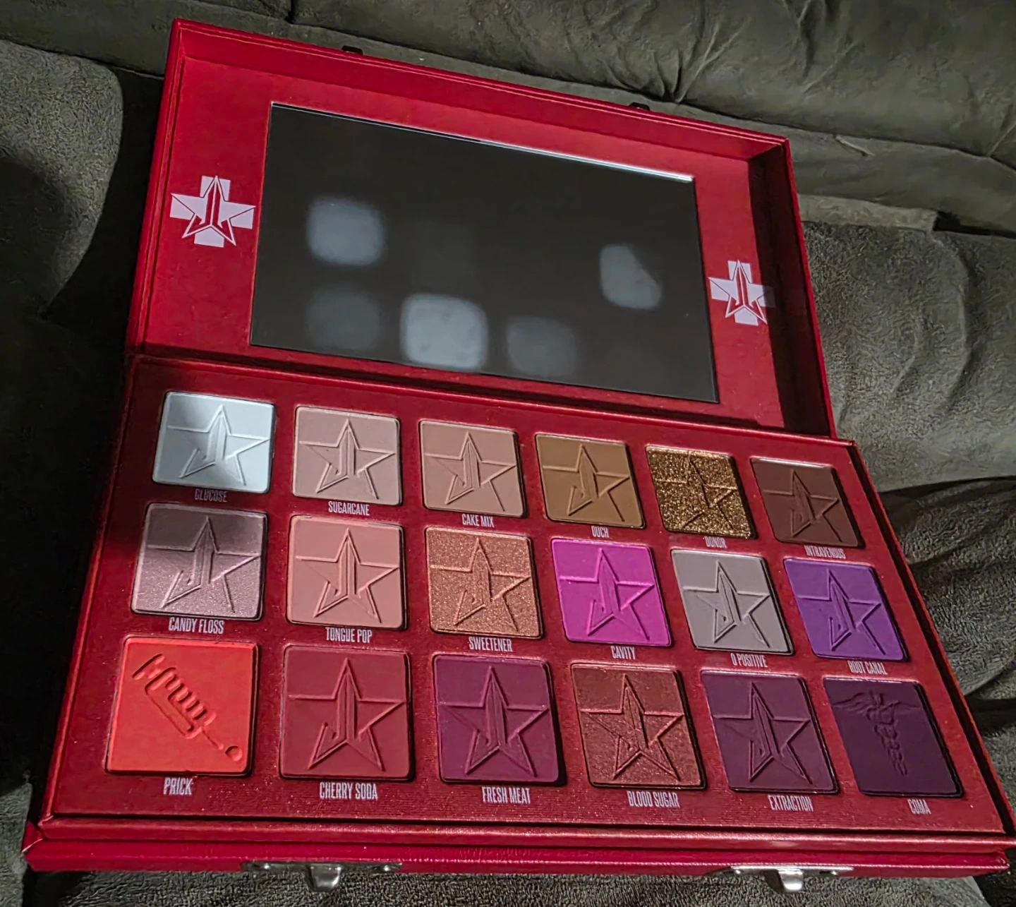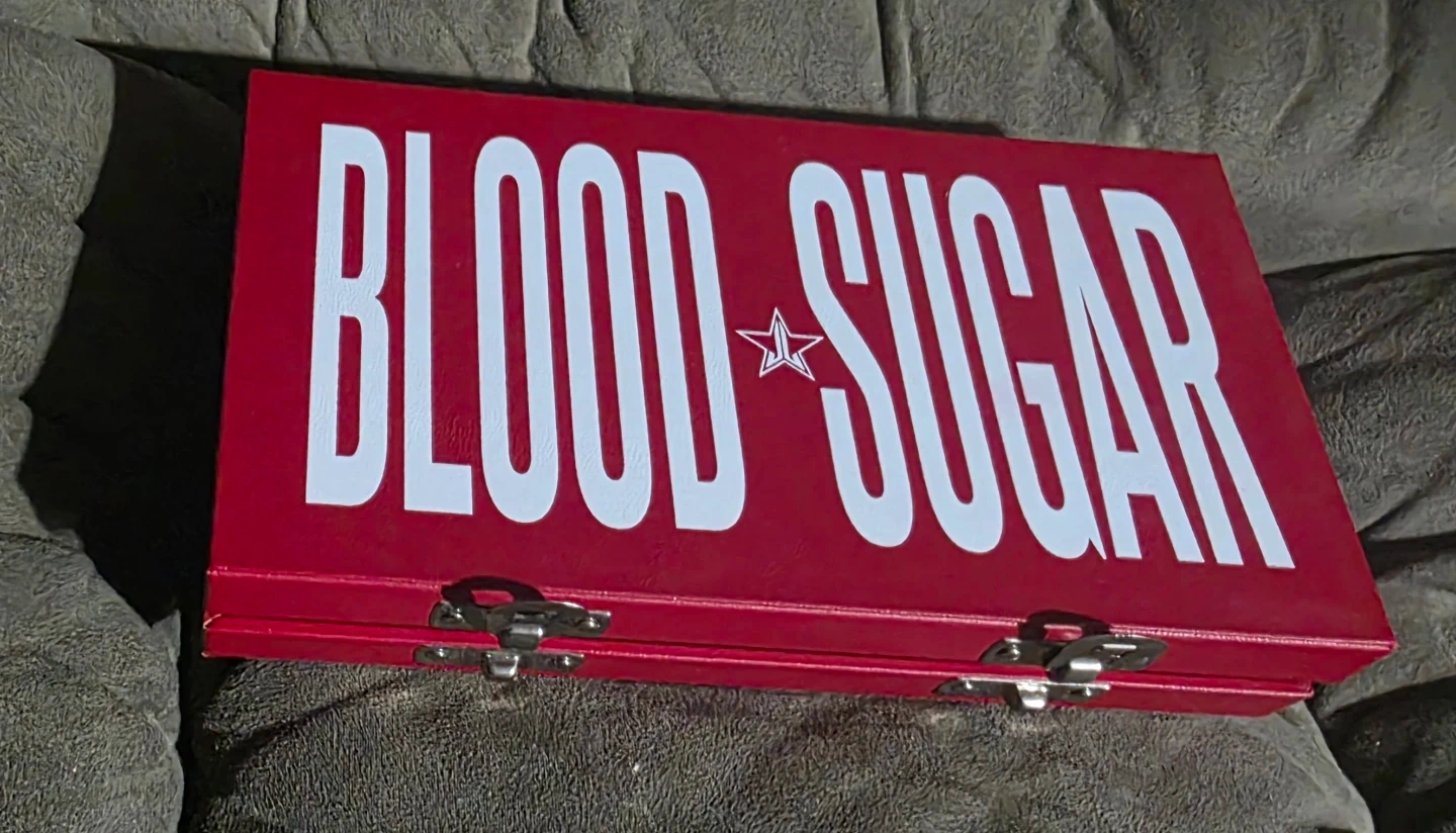 Jeffree Star Blood Sugar eyeshadow palette! This palette features a range of red and pink shades, perfect for creating bold and vibrant looks. The palette is out of box but never used.