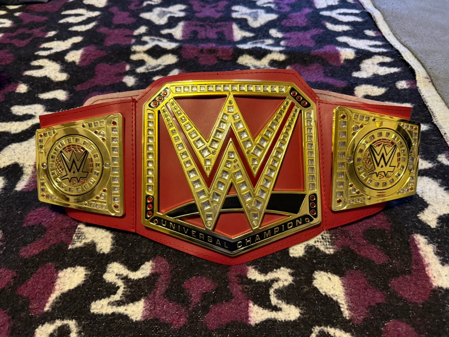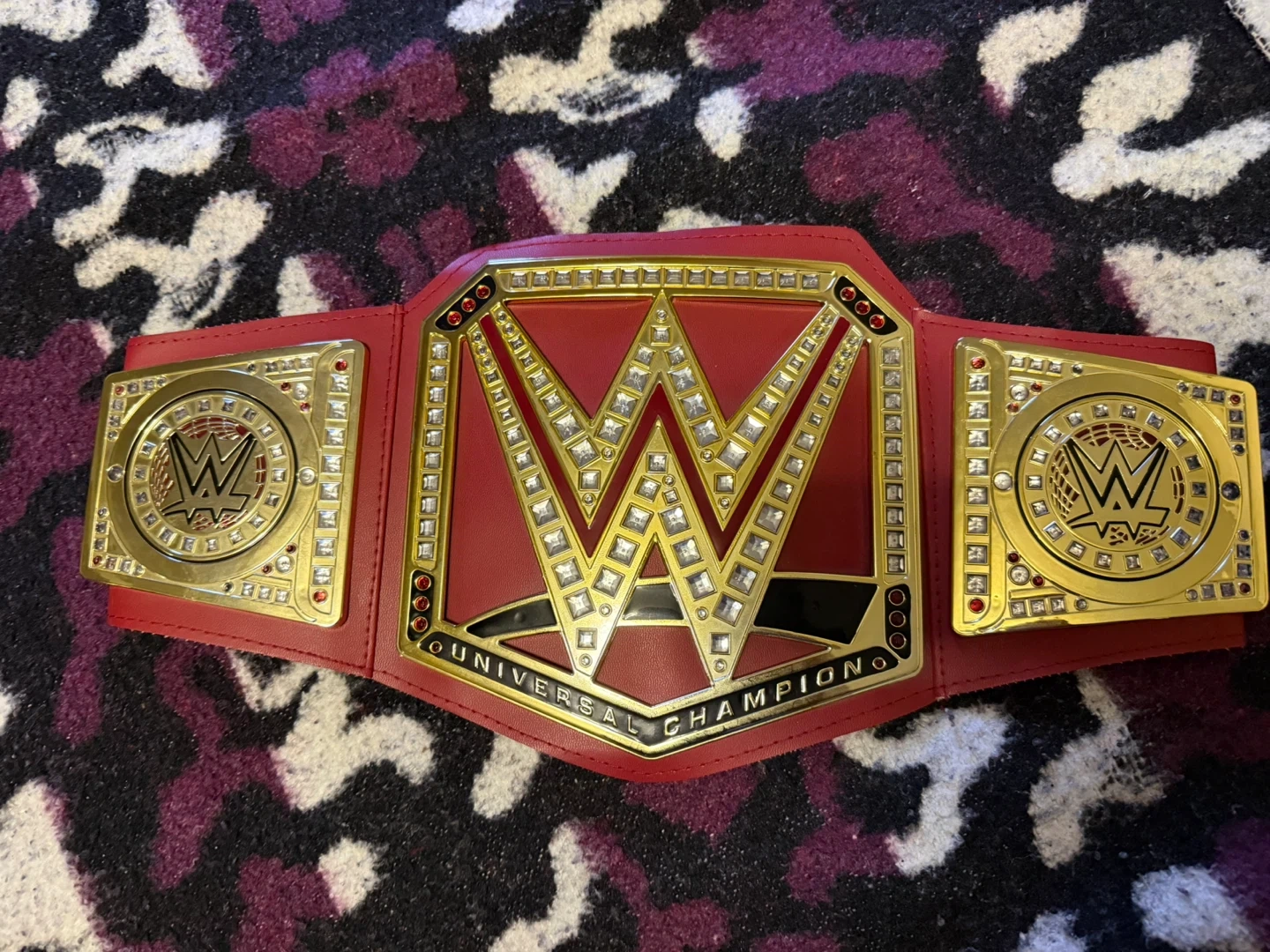 This is a WWE Universal Champion toy belt. It's made with red faux leather and gold-coloured metal plates. The centre plate features the 'W' logo and 'Universal Champion' text. It's a great display piece for wrestling fans!