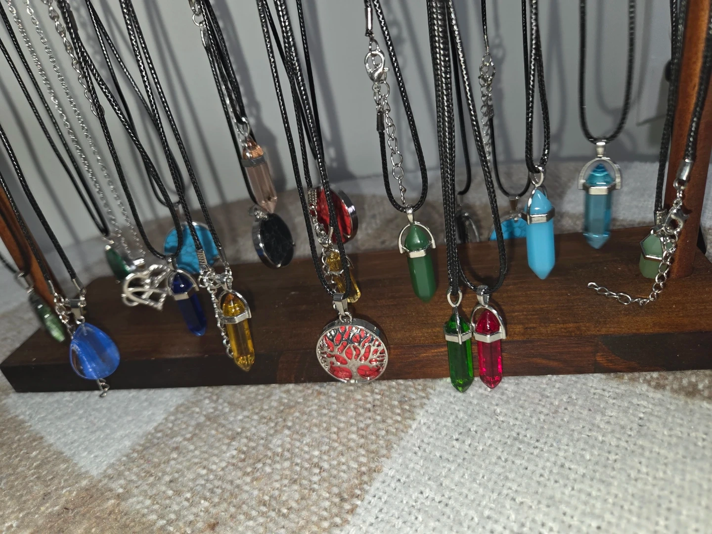 This collection includes a variety of fashion rings with different designs and pendants, along with several stone-embellished necklaces. The rings are made of metal, and the necklaces feature various stone types and charms. They're suitable for adding a unique touch to any outfit. The 925 silver heart pendant and chain.