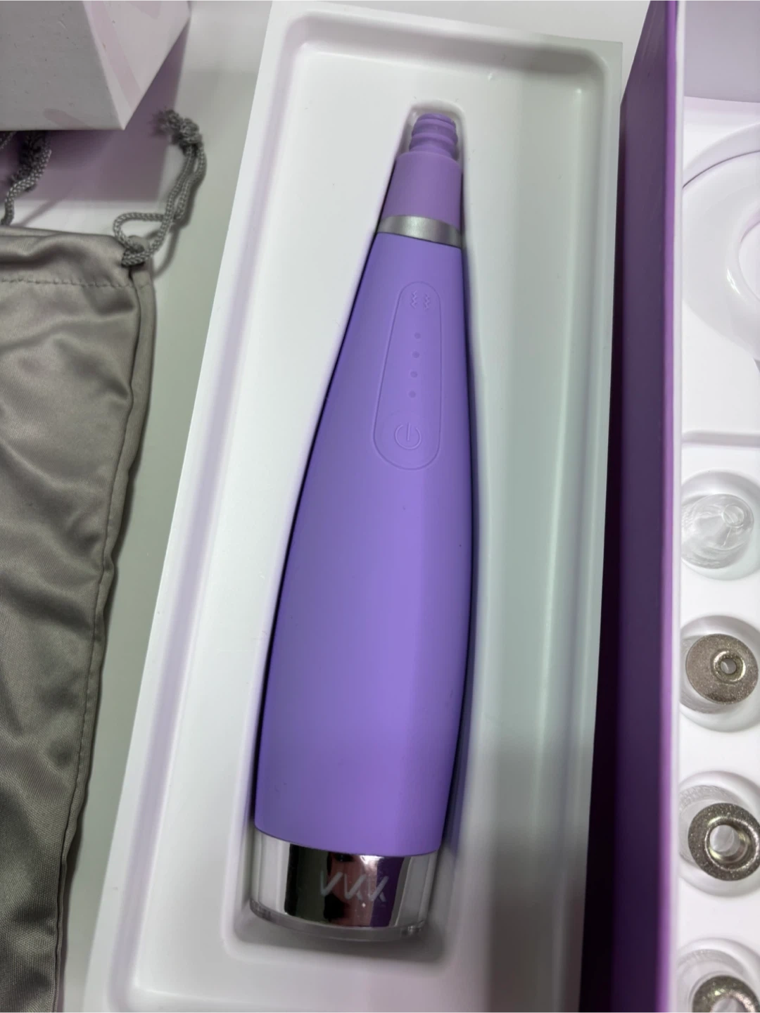 This VVK vacuum blackhead remover comes in a lovely lavender colour. It includes a USB charging cable and multiple interchangeable suction heads for different areas. It's powered by a rechargeable battery and has multiple intensity levels.