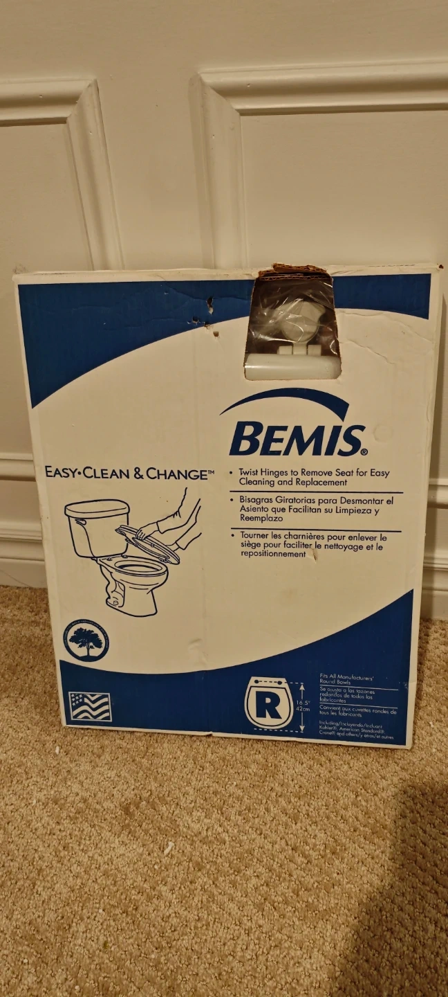 This Bemis toilet seat features Easy-Clean & Change twist hinges for simple seat removal and replacement. It's made with durable molded wood and has a finish that resists chipping and scratching. It fits all manufacturers' round toilet bowls.