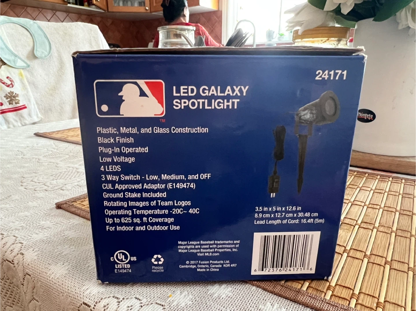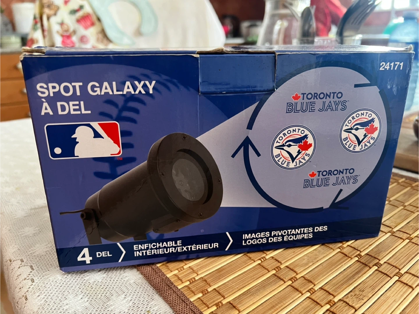 This is a Toronto Blue Jays LED Galaxy Spotlight. It's plug-in operated and features 4 LEDs with a 3-way switch for low, medium, and off settings. Includes CUL-approved adaptor and ground stake for indoor or outdoor use.