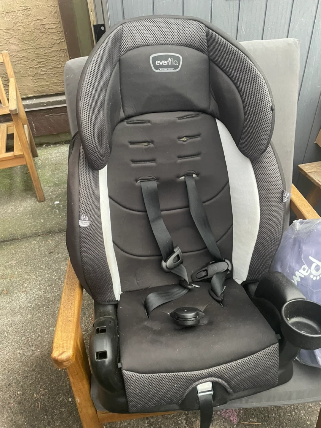 Selling an Evenflo car seat in great condition! It's black and grey, perfect for keeping your little one safe and comfy on the road. Suitable for use with the 5-pt harness for kids between 10 and 18.1 kg (22 and 40 lbs) and whose height is between 71 and 127 cm (28 and 50 in) and whose ears are below the top of the car seat headrest
