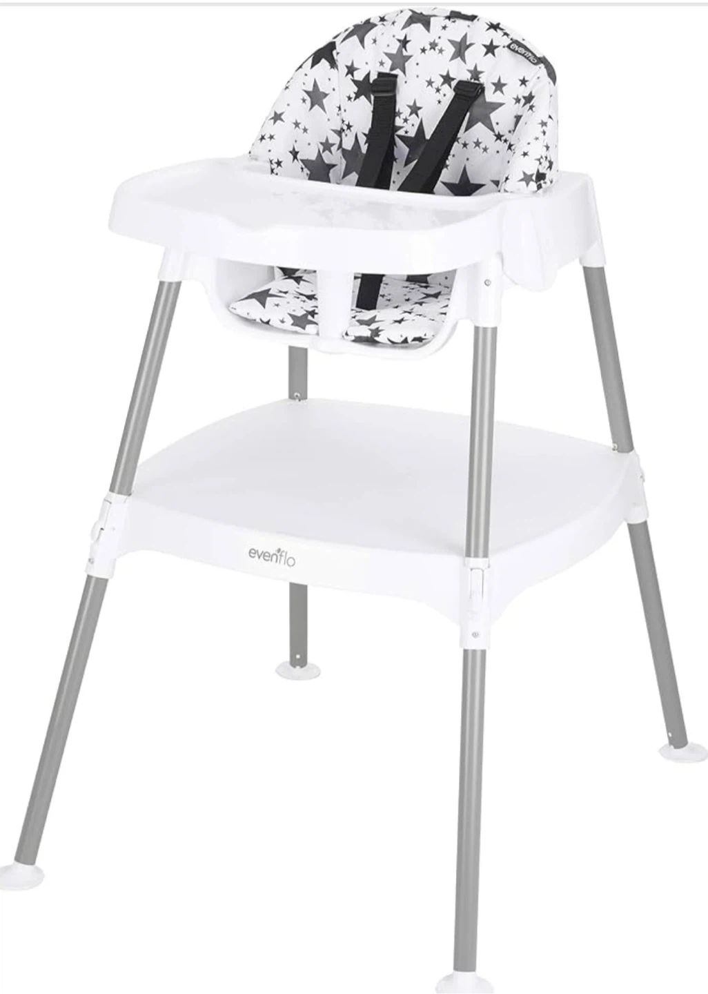 0This Evenflo Eat & Grow Convertible High Chair is perfect for your little one! It's in great condition and ready for a new home. The chair features a stylish white and grey star pattern on the seat and includes a convenient tray for easy feeding. It's designed to grow with your child, converting from a high chair to a toddler chair. A great addition to any family!