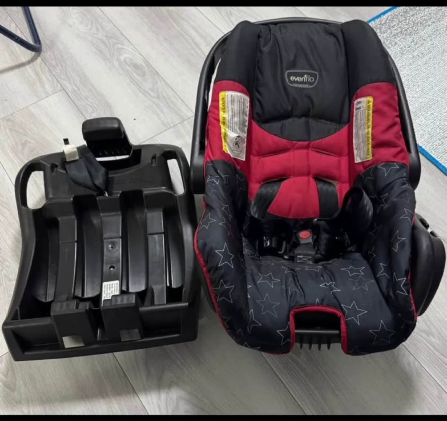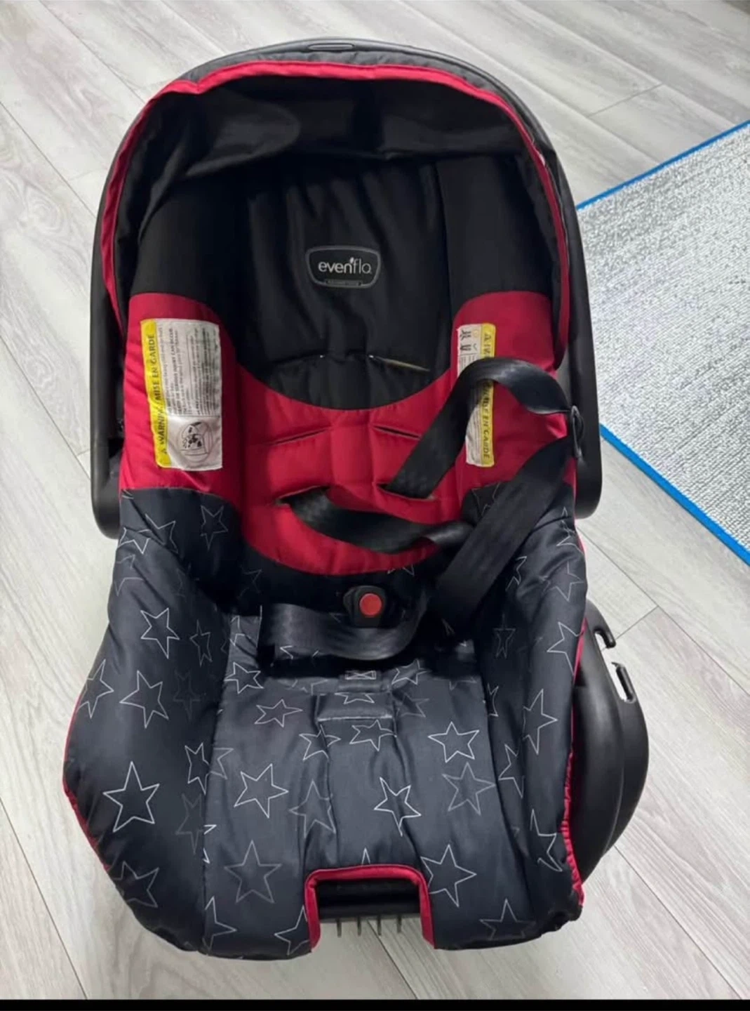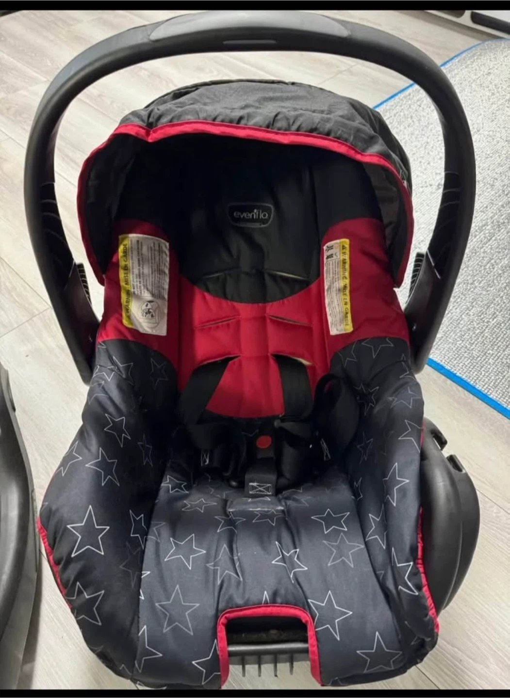 10Selling an Evenflo infant car seat that comes with the base for easy installation in your vehicle. The car seat features a black and red design with star patterns on the seat padding. It's in great shape and ready for a new little passenger!