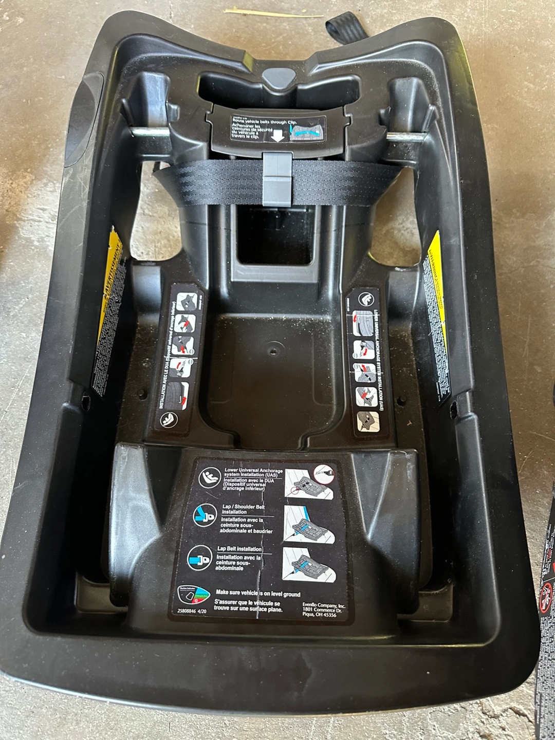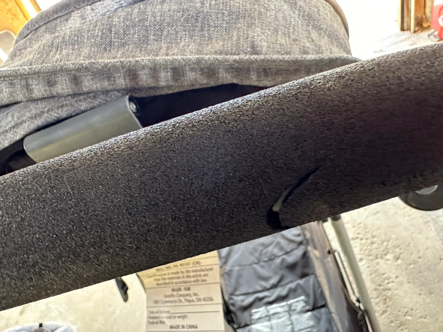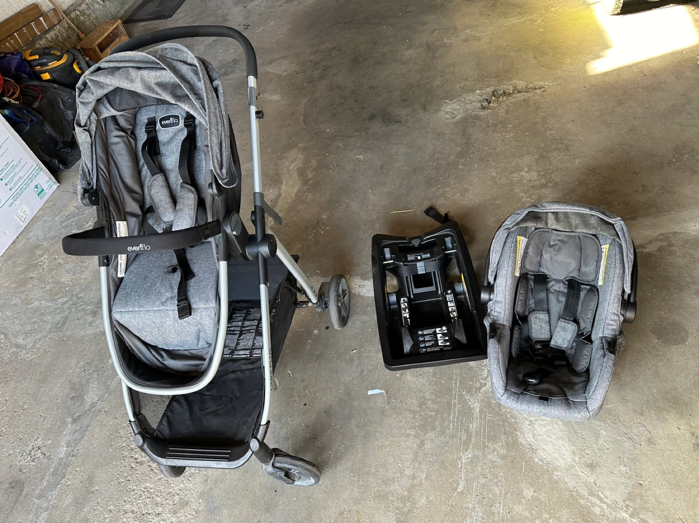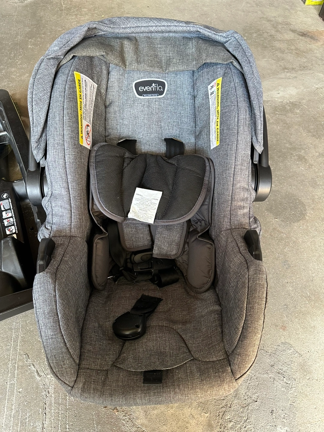 5Stroller, car seat, and base. Grey colour. Minor wear on the handlebar.