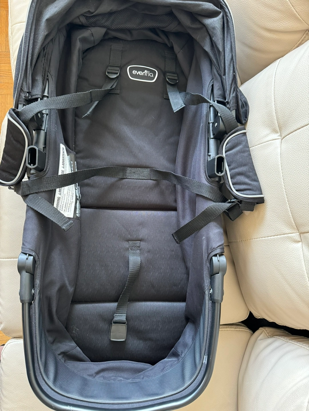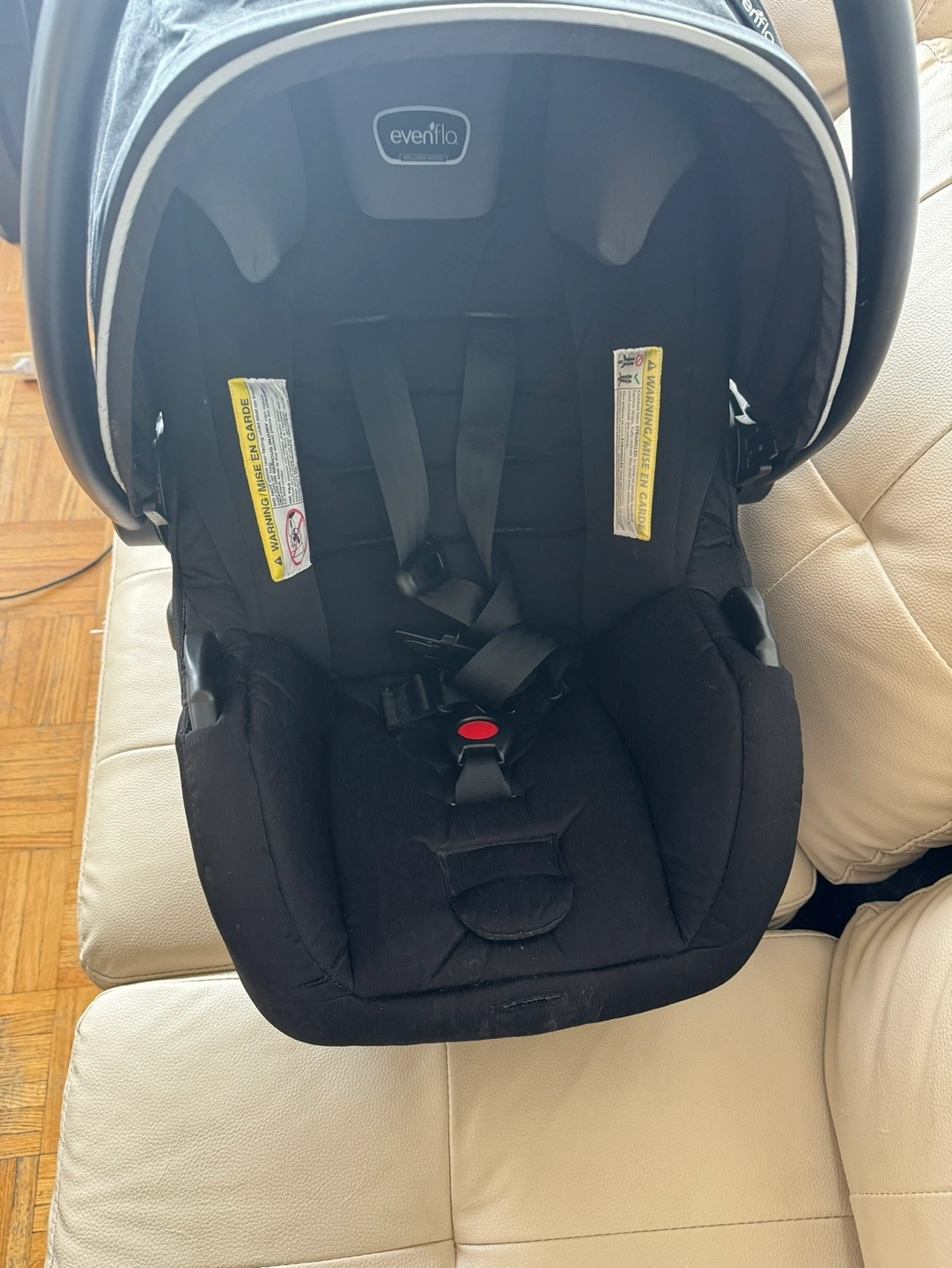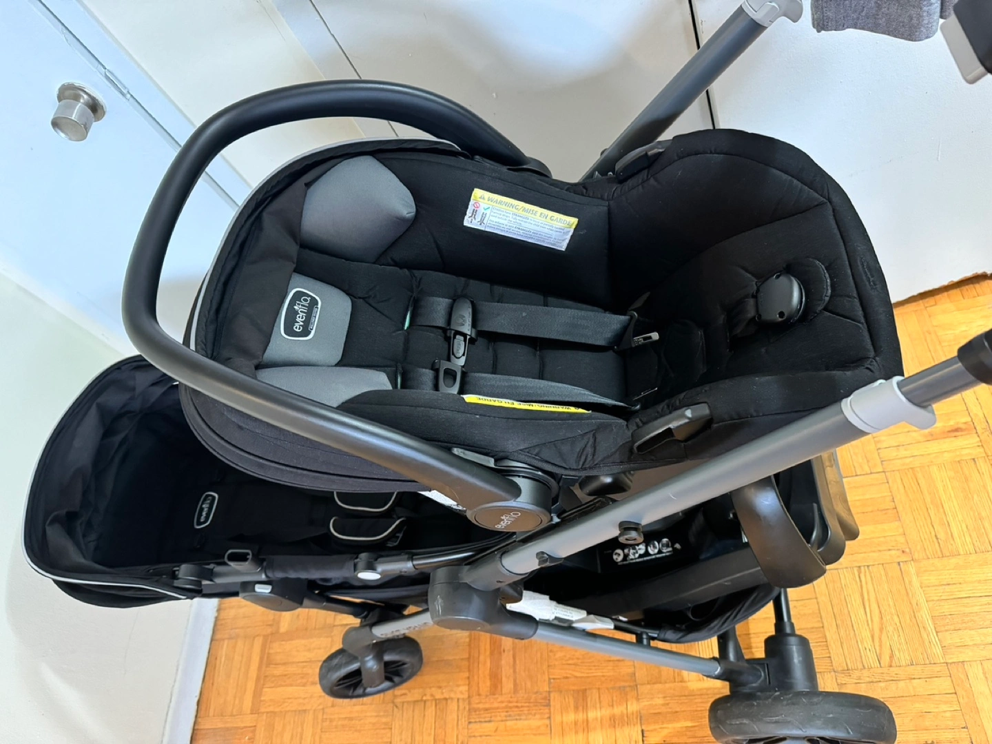 24Evenflo Pivot Xpand Stroller, black color. Includes: Car seat & base, -Bassinet, -Stretchable mesh net & -Clear Rain cover (protection from weather & bugs) Stroller has a foot lock & release, that stops it in place. Rubber tires can easily tread on snow/mud, easy cleaning surfaces. Detachable bassinet can be used to carry sleeping baby or adjusted to seating angle/position when baby is awake. Car seat & bassinet can be fitted together to carry 2 babies together. Mesh underneath can be used to store diaper bag on the go. Purchased this year, gently used, in clean condition. Will deliver at a little extra cost.
