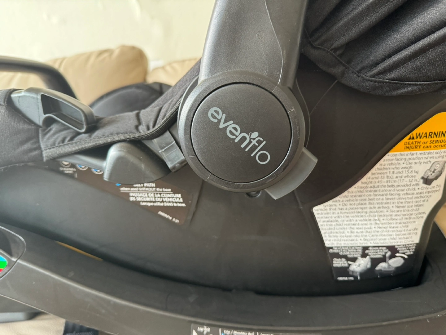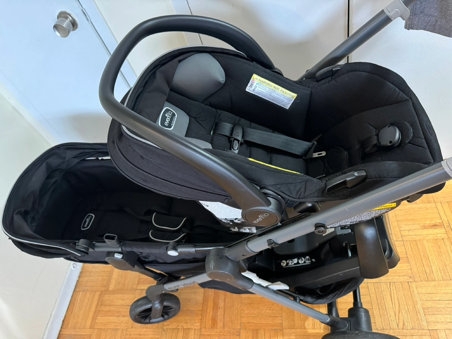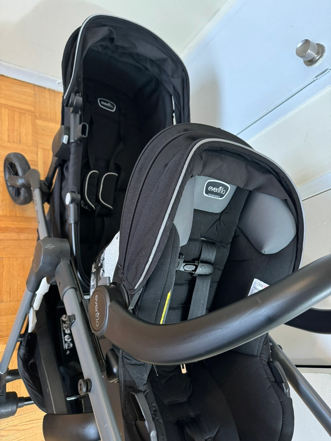 24Evenflo Pivot Xpand Stroller, black color. Includes: Car seat & base, -Bassinet, -Stretchable mesh net & -Clear Rain cover (protection from weather & bugs) Stroller has a foot lock & release, that stops it in place. Rubber tires can easily tread on snow/mud, easy cleaning surfaces. Detachable bassinet can be used to carry sleeping baby or adjusted to seating angle/position when baby is awake. Car seat & bassinet can be fitted together to carry 2 babies together. Mesh underneath can be used to store diaper bag on the go. Purchased this year, gently used, in clean condition. Will deliver at a little extra cost.