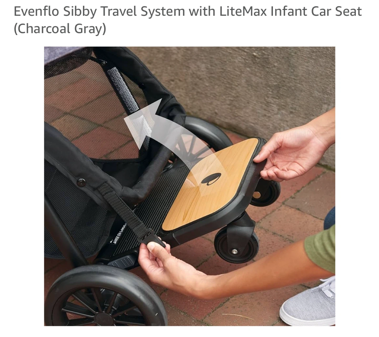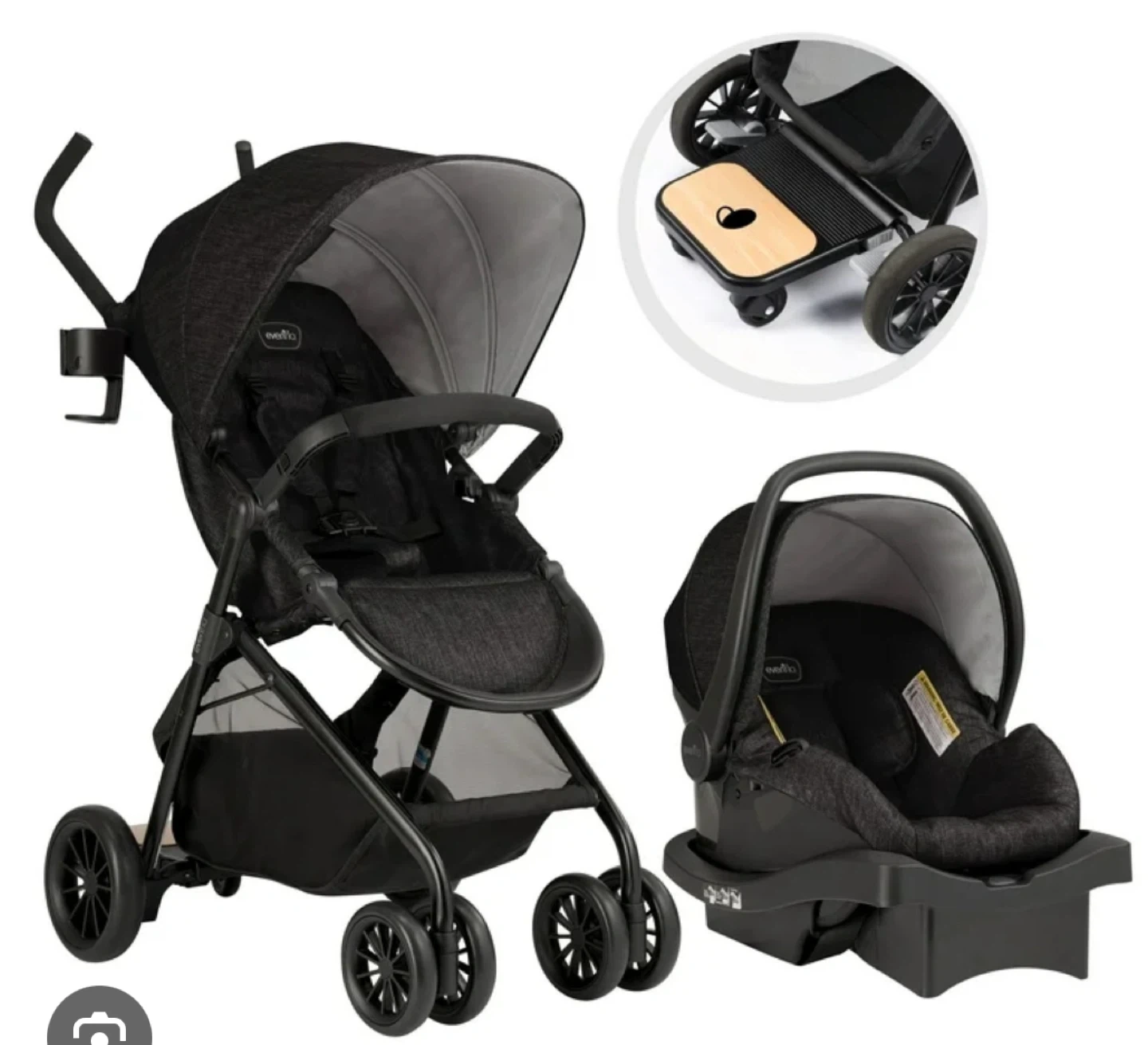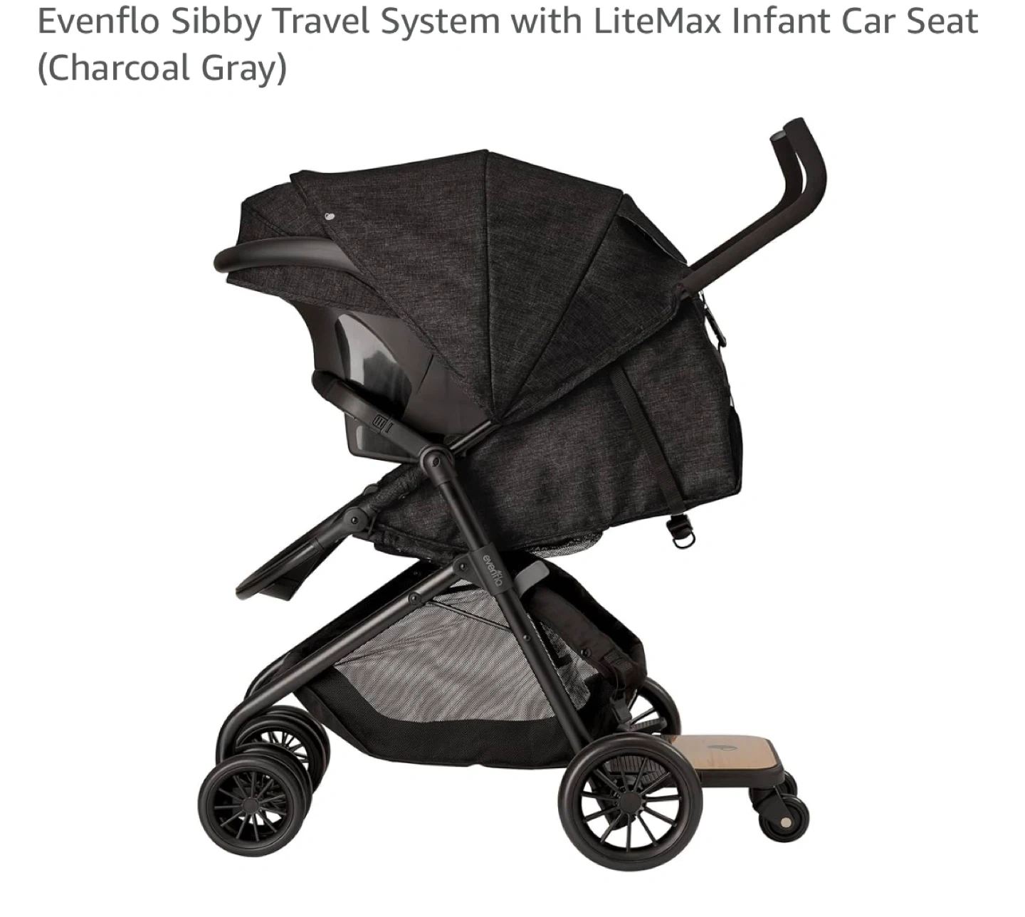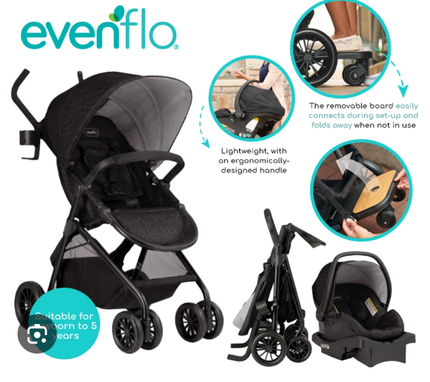GENTLY USED FOR A FEW MONTHS. The Evenflo® Sibby Travel System is the perfect stroller for a growing family. The Sibby offers a Ride-Along board allowing 2 children to ride at the same time. The Ride-Along board connects easily during set-up and folds away when not in use. This added value is a convenient option from having a double stroller for 2 children. The lift-to-fold design folds compactly and fits easily in any size vehicle from large to small. The new Cruiser Tires have a sleek look and the oversized rear wheels provide a smooth ride. The Sibby Travel System is paired with the LiteMax Infant Car Seat, for babies 4-35lbs. This seat has been rollover and side impact tested to provide safety where your child needs it most. The base includes an integrated belt lock-off system which provides peace of mind the base is securely and correctly installed. The seat is lightweight and includes upfront harness adjustment and a plush infant head support. The ergonomic handle makes it easier to carry and the hassle free transfer from the stay-in-car base makes for a quick and safe connection. Additional features include: Oversized storage with front and rear access, large coverage canopy to shield from the elements, multi-position recline for comfort, removable arm bar for easy in and out, Sport Style handle grips are comfortable and easy to maneuver, Flex-Hold parent cup holds cups tightly. Features: Built-In Rear Footboard, Canopy, Child Grab Bar, folds for easy transport and storage, Front Swivel Wheels, Storage Basket Beneath Seat, accepts infant car seat (no adapter needed), reclining seat; • Stroller Functions: Accommodates 1 Infant Car Seat, Reclining Seat, Front Swivel Wheels, Folds for Easy Transport, Comfort-grip Handle • Safety and Security Features: 5-point Harness • Certifications: Meets ASTM Standards • Care and Cleaning: Wipe Clean with Soap and Water, Machine Wash • Min. Carseat Weight Supported: 4 pounds • Max. Carseat Weight Capacity: 35 pounds • Min. Stroller Weight Supported: 0 pounds • Max. Stroller Weight Capacity: 50 pounds • Manufacturer's Suggested Age: 0-5 years • Material: Polyester, Plastic, Steel