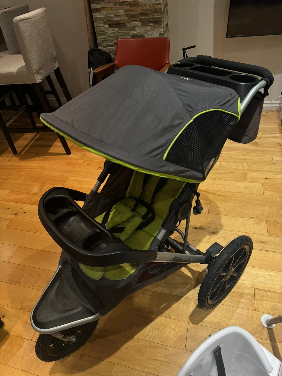 29Selling an Evenflo Victory jogging stroller in a grey and green colour scheme. It's in good condition and ready for your little one's adventures! Features include a parent tray with cup holders, a large storage basket, and a sun canopy.