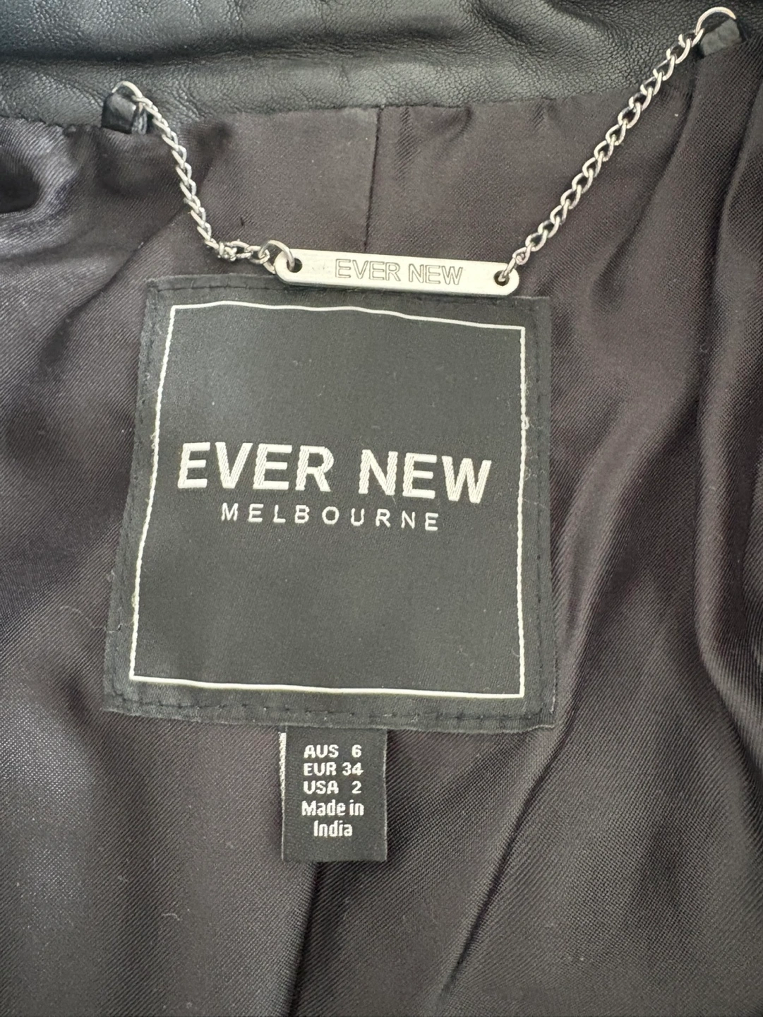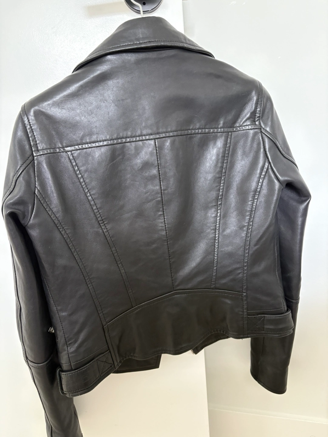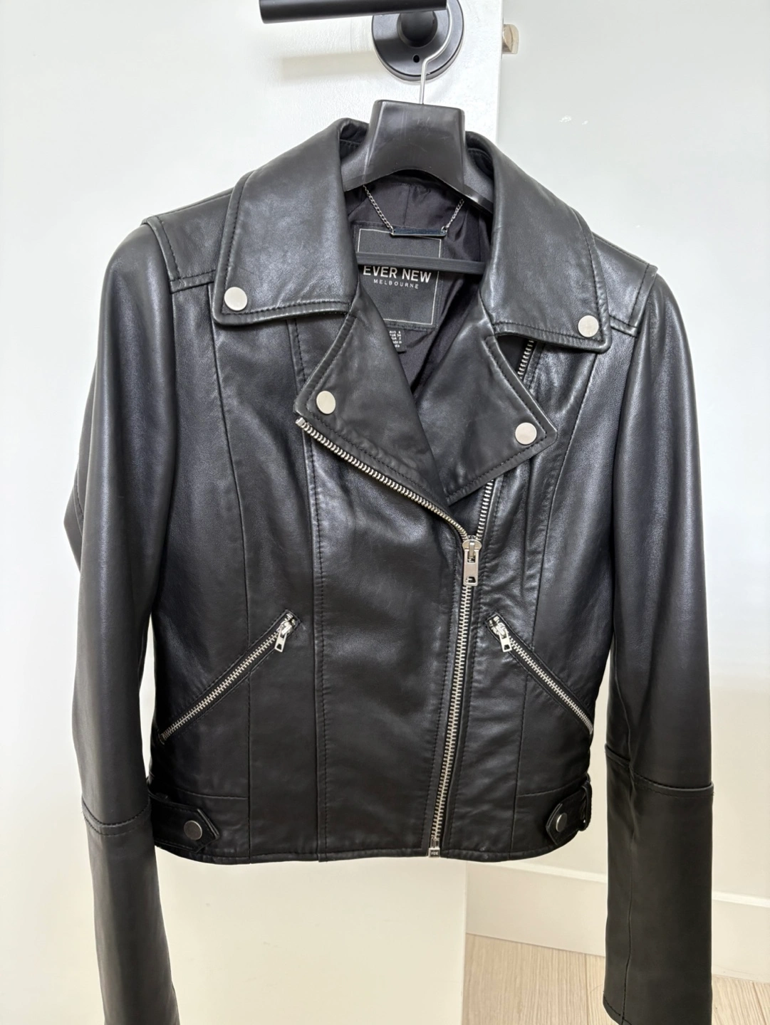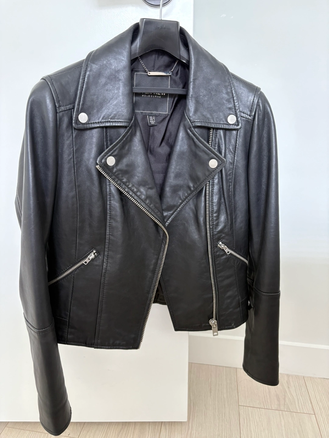 10Women's black leather moto jacket. Asymmetrical zipper. Multiple pockets. Excellent condition almost like new. A must have fashion item.