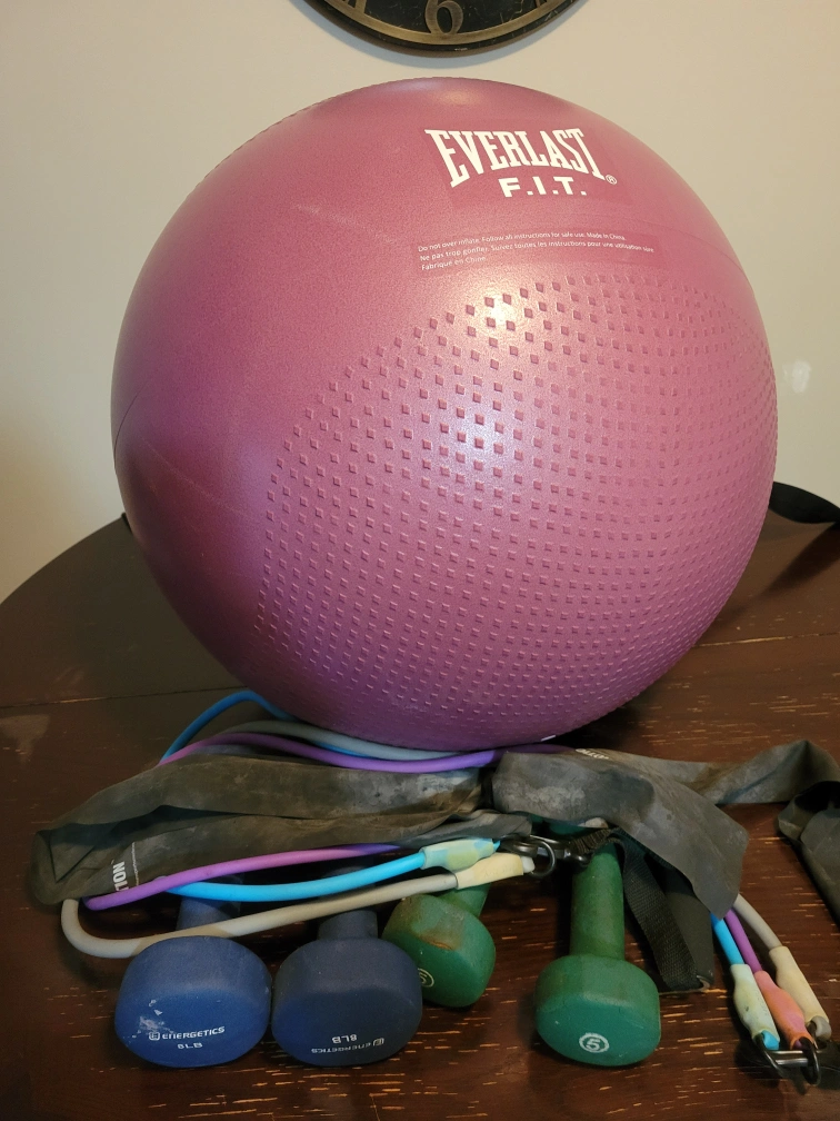 Selling a set of home workout equipment! Includes an Everlast F.I.T. exercise ball, resistance bands, and a set of Energetics dumbbells. The dumbbells are 5lb and 8lb. Great for starting a home fitness routine!