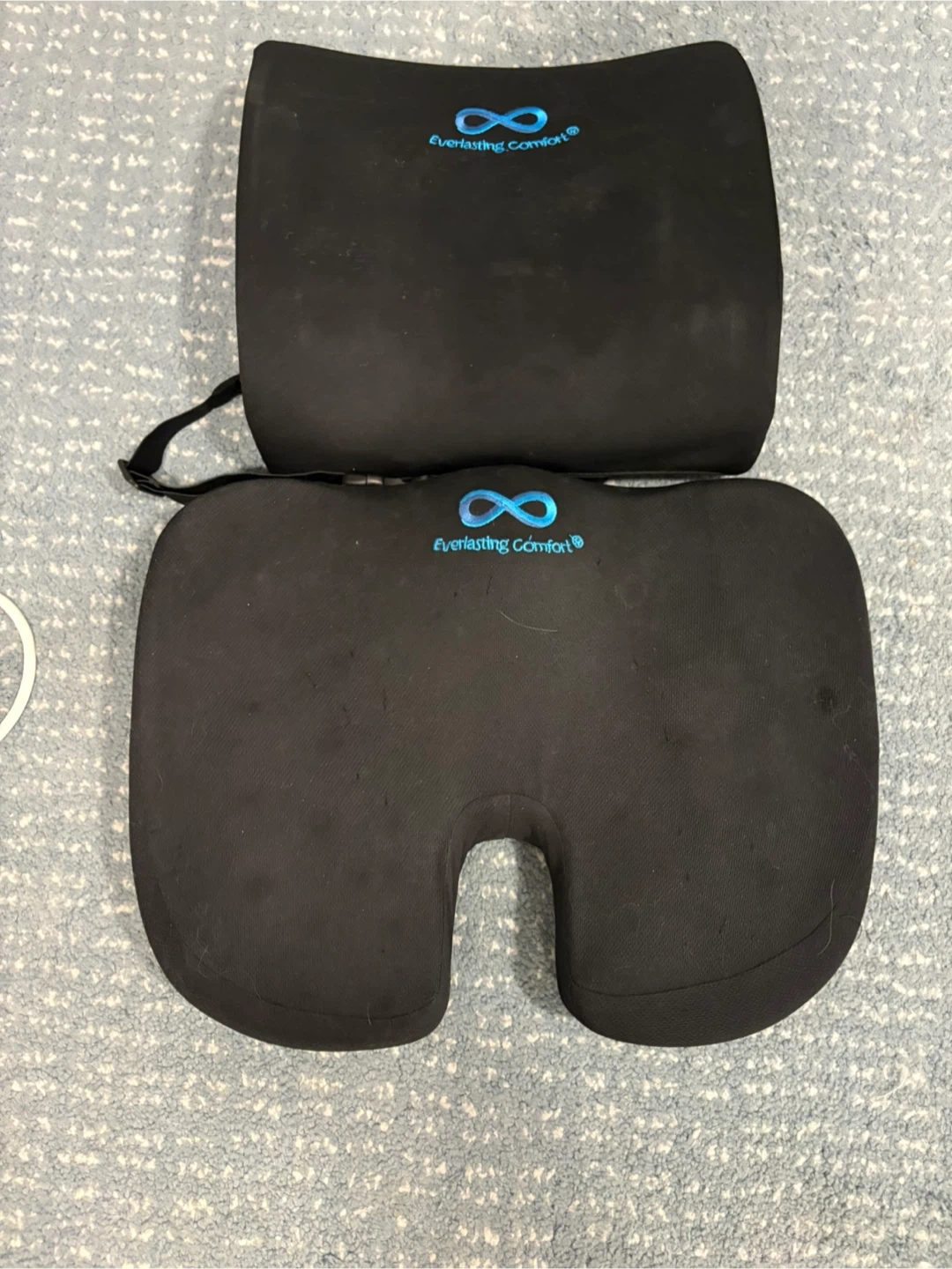 47I'm selling an Everlasting Comfort seat cushion and lumbar support set. These are great for providing extra comfort and support while sitting for long periods. They have some signs of use but are still in good condition and ready to help you improve your posture and comfort. Perfect for home, office, or car!