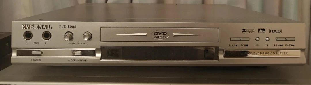 16Selling an Evernal DVD-8088 DVD/CD/MP3 Player. It features Dolby Digital, DTS, and HDCD support. It also has microphone inputs, and front panel controls for play, stop, and navigation