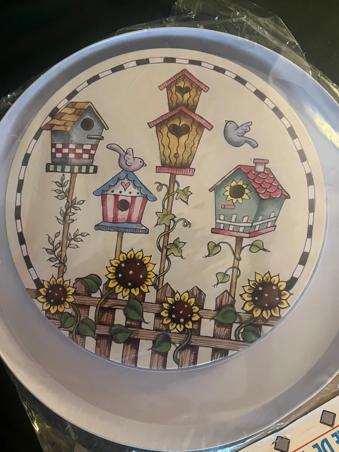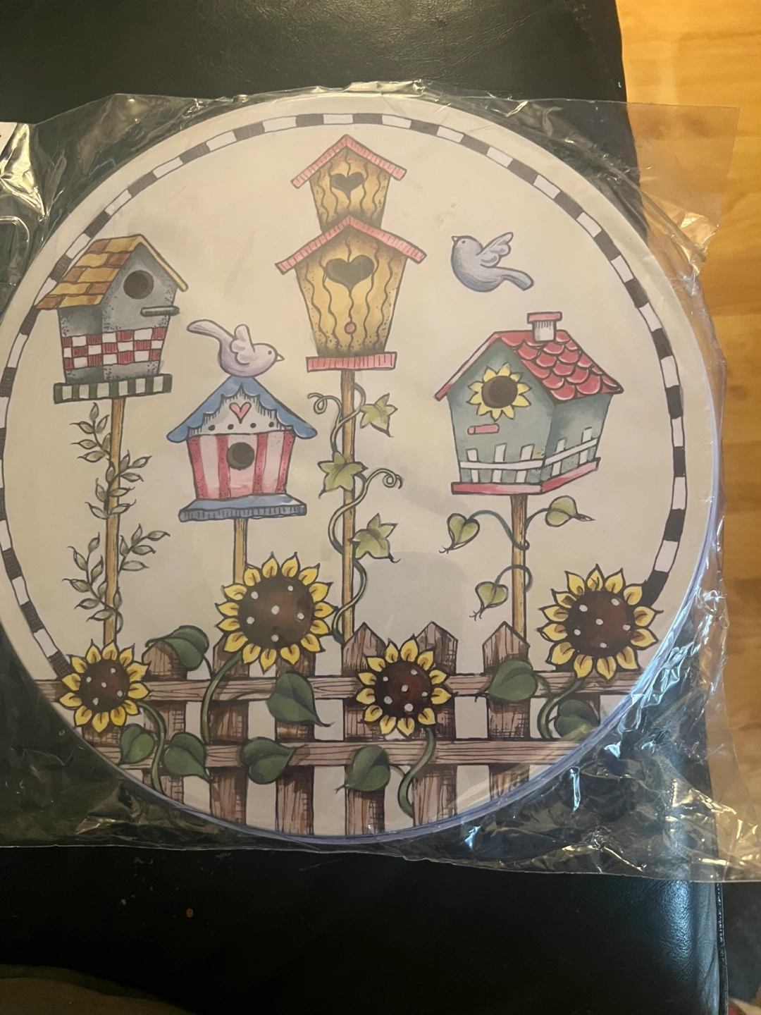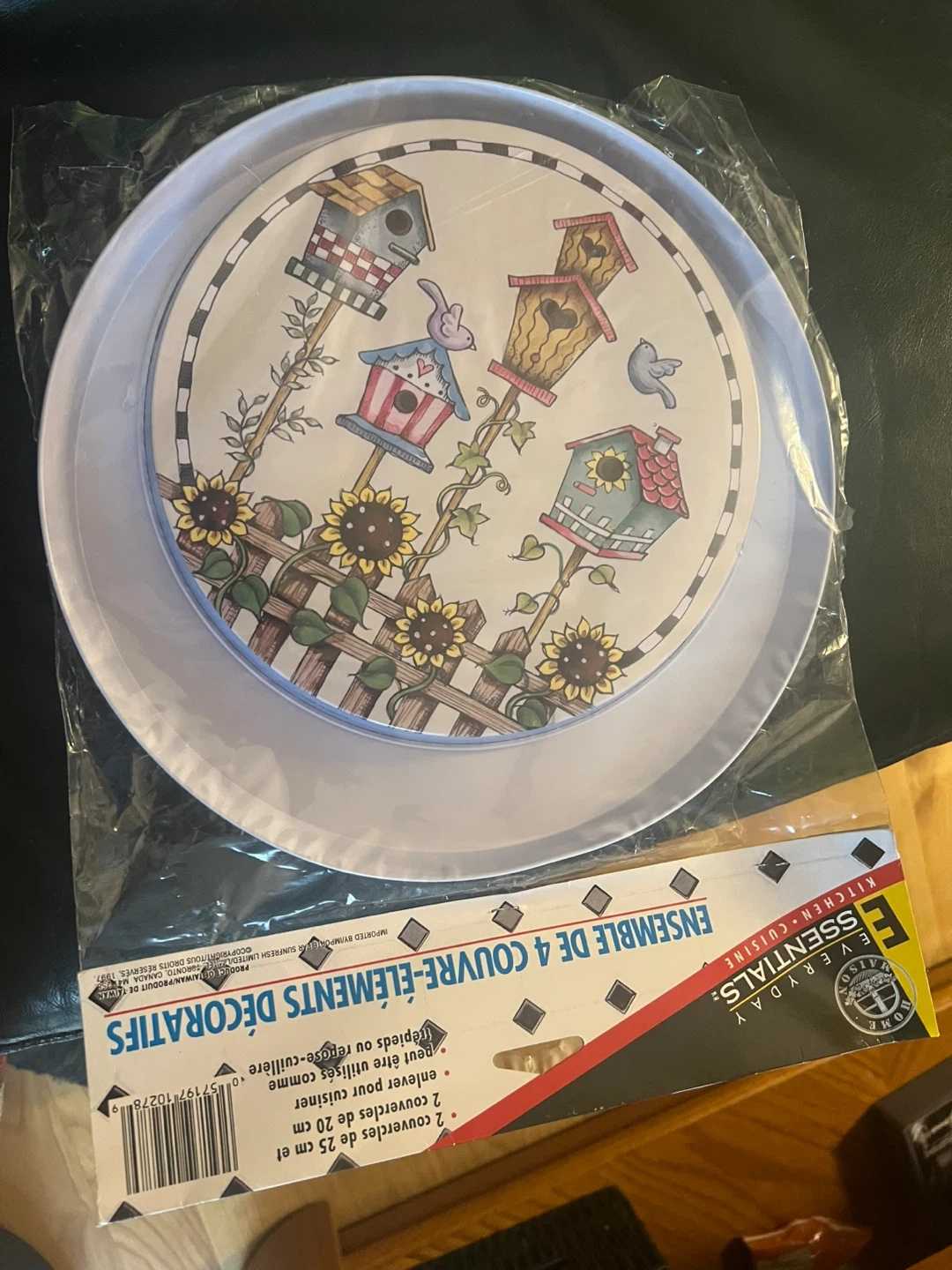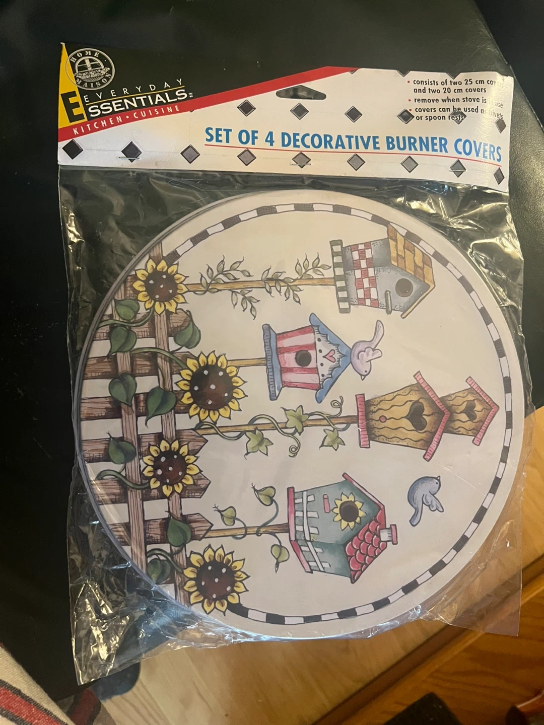 82Selling a set of 4 decorative burner covers from Everyday Essentials! They're brand new and still in the original packaging. The covers are decorated with a cute birdhouse and sunflower design, perfect for adding a touch of charm to your kitchen