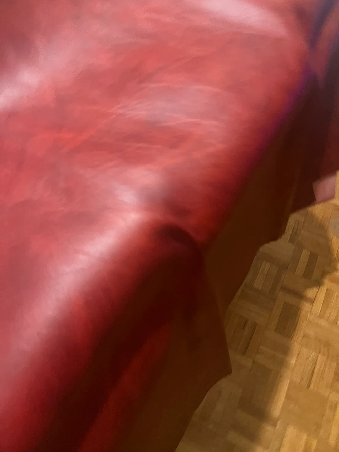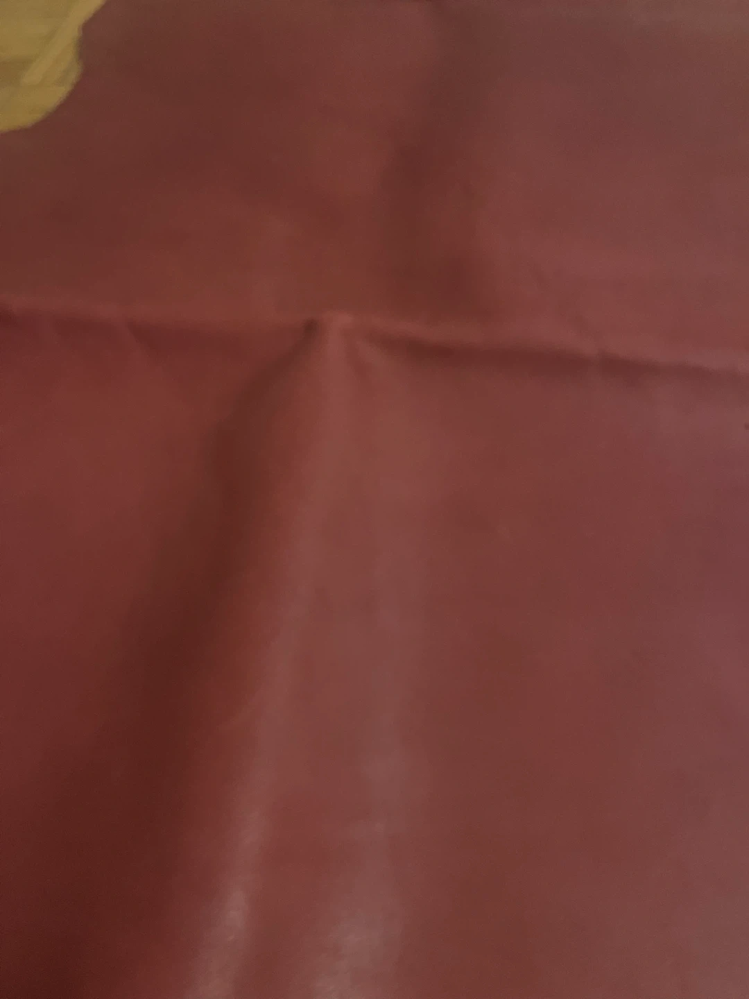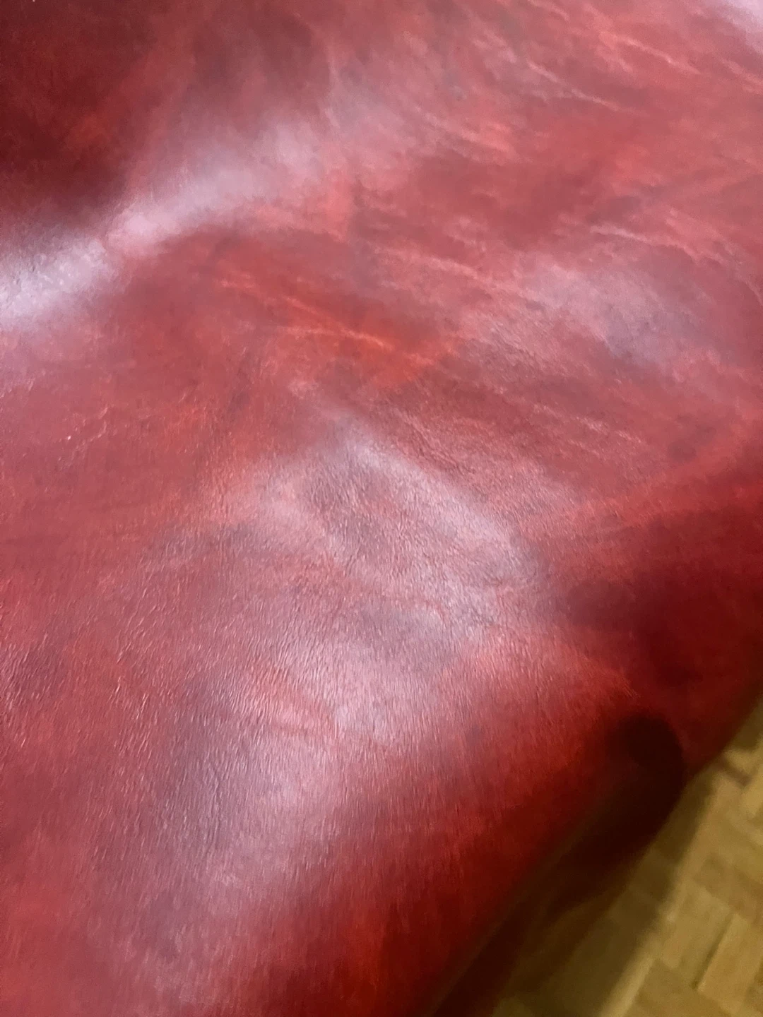 Genuine red vinyl material. It has a smooth finish and a rich colour. This material is suitable for various crafting projects. You'd use this for making bags or custom upholstery.