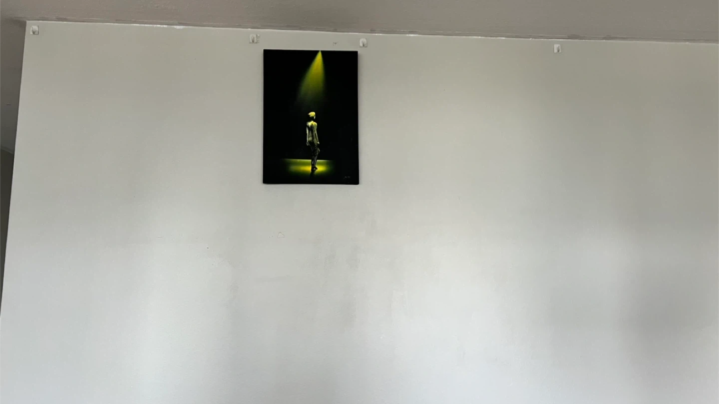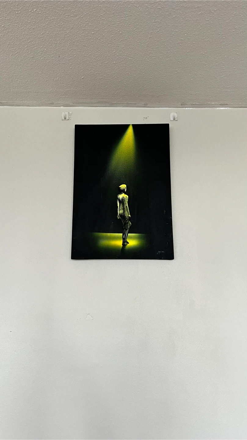 This is a piece of artwork featuring a solitary figure illuminated by a bright spotlight against a dark background. The yellow light creates a dramatic effect on the subject. The signature "Joey 2003" is visible on the bottom right. It's a unique decorative item for any space!