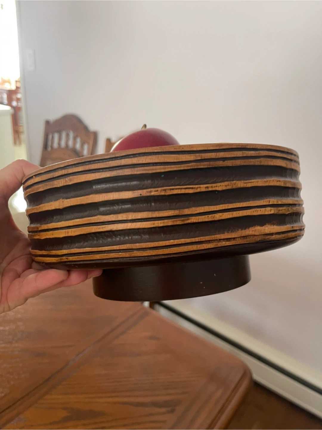 This set includes a wooden bowl with decorative apples. It's a nice touch for kitchen decor. Adds a pop of colour to any room!