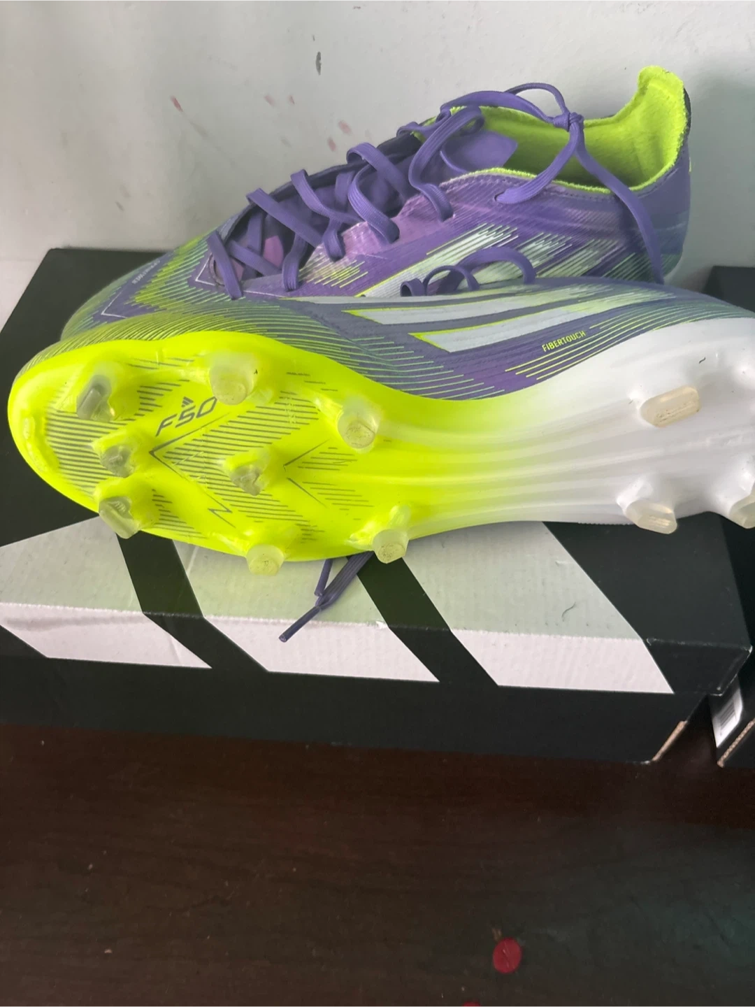 These Adidas F50 football cleats feature a vibrant purple and neon green design. They're built for performance on the field. Comes with original box.size 10