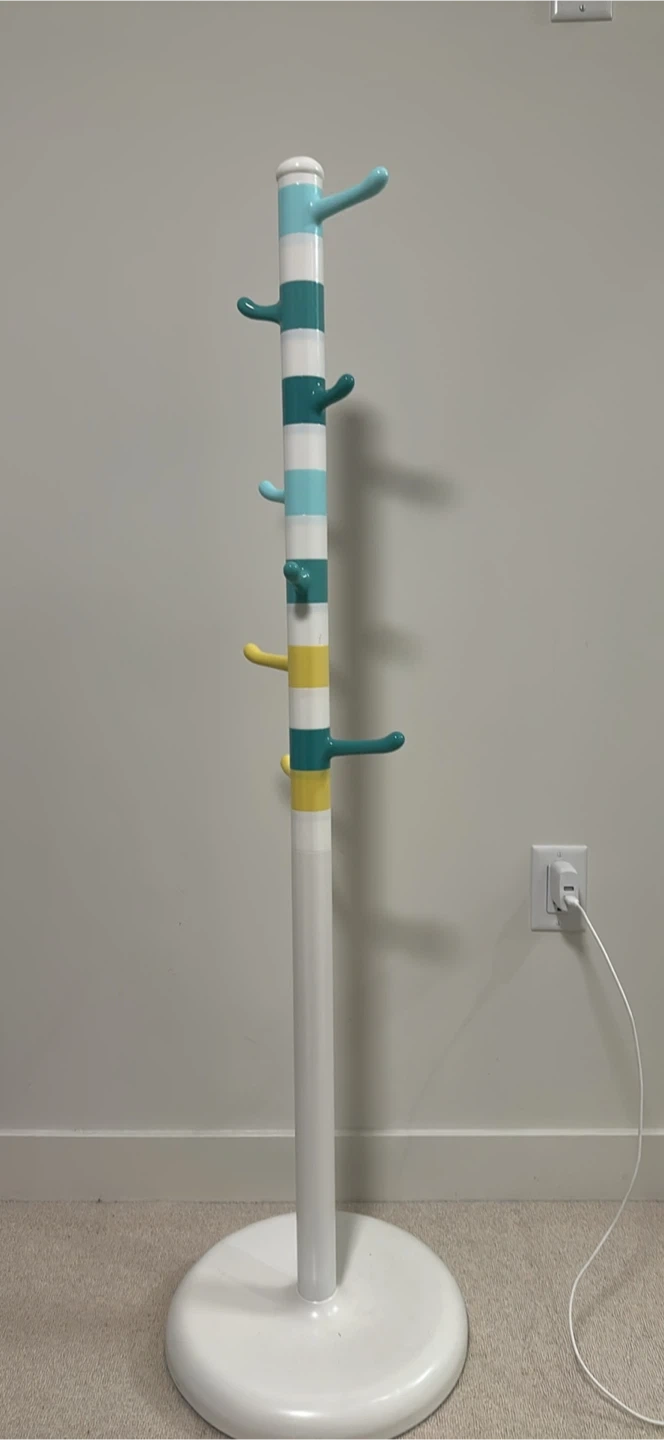 A colourful coat rack with multiple hooks. It's made of metal and features a white base. It's perfect for hanging jackets, hats, or bags in an entryway or bedroom.