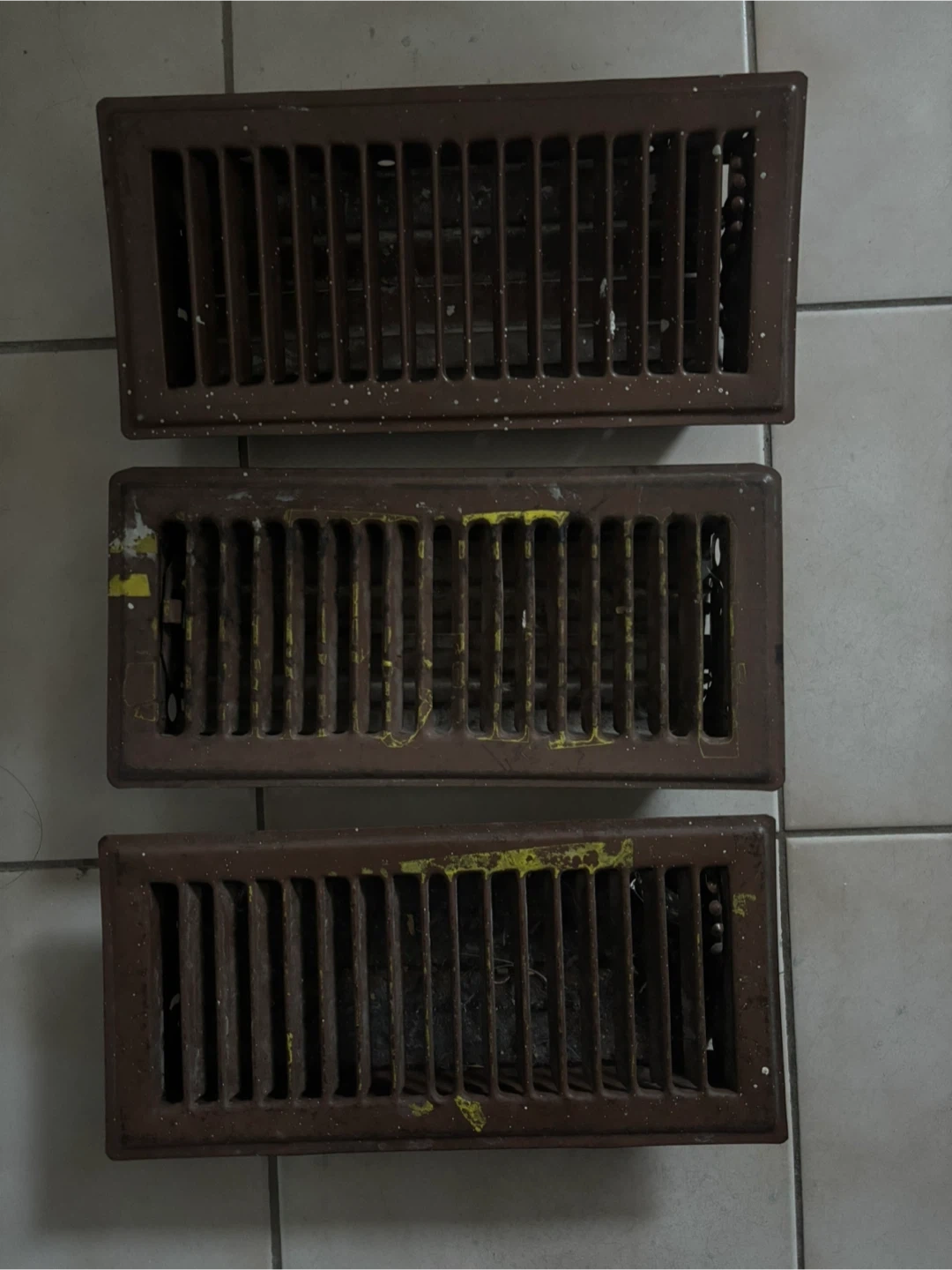 This is a set of three vintage HVAC floor vents. They are made of brown metal and have a classic slatted design. Some have minor yellow paint marks and show signs of age, common for items of this era. They're suitable for restoring older homes or for creative DIY projects.