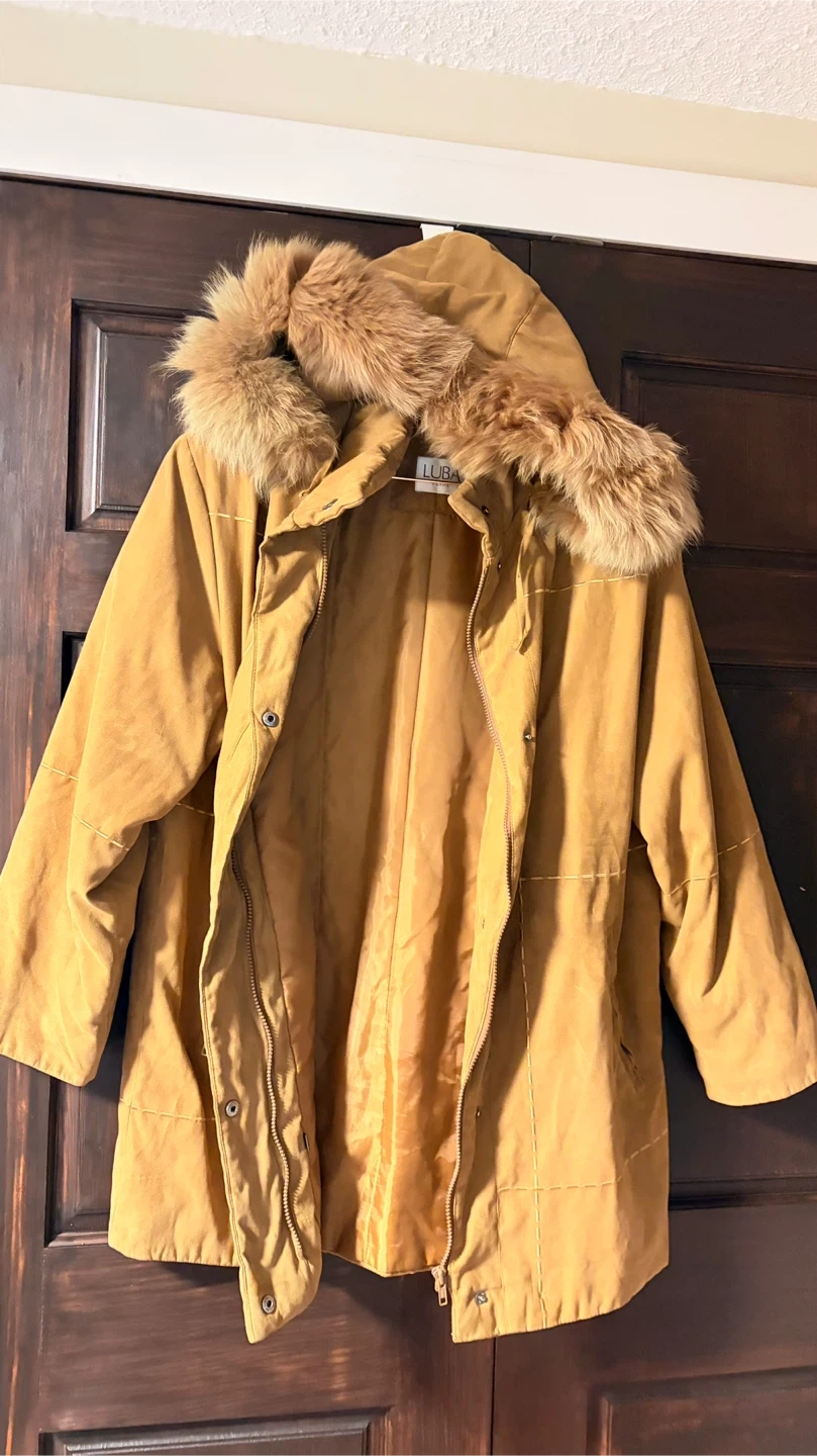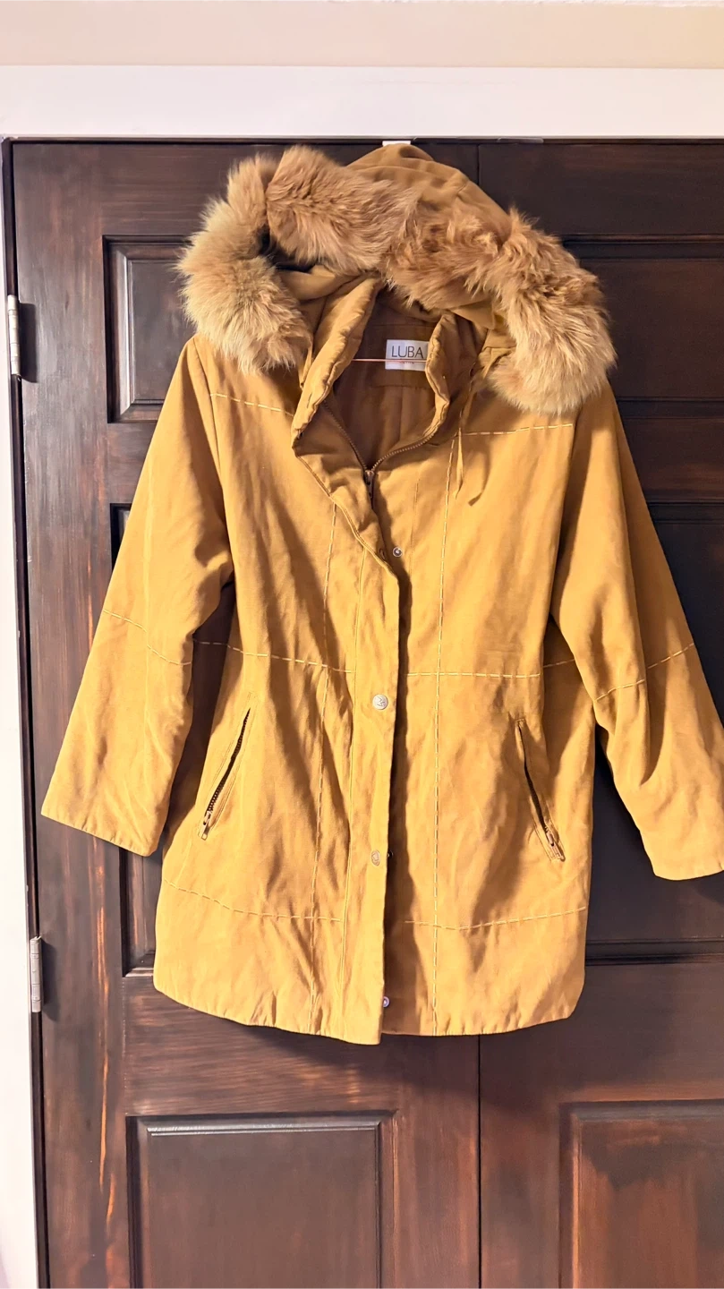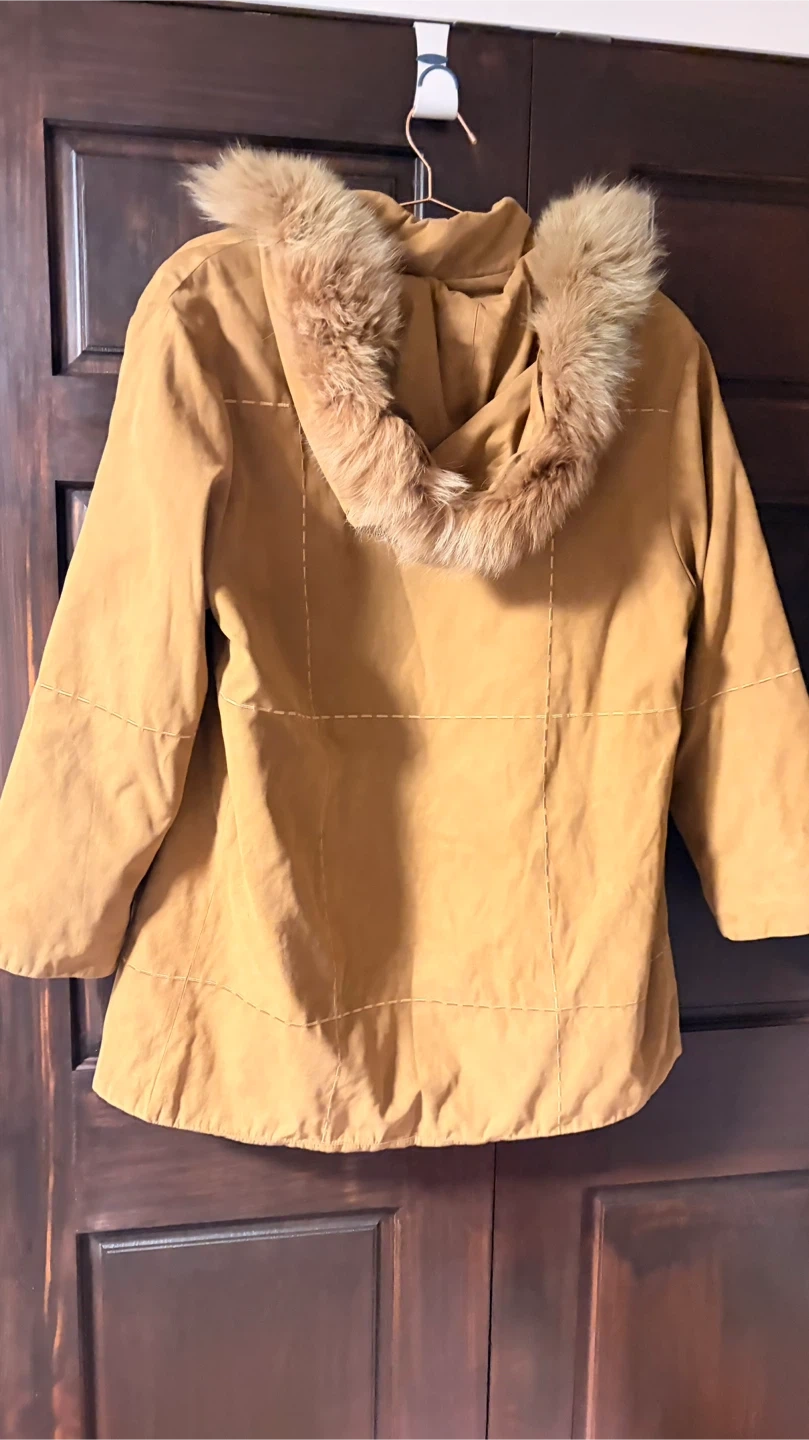 This Luba Petite jacket features a warm tan colour and a cosy faux fur trim on the hood. It's made from a suede-like material and has a zip and button closure. Two zippered pockets are on the front.size large