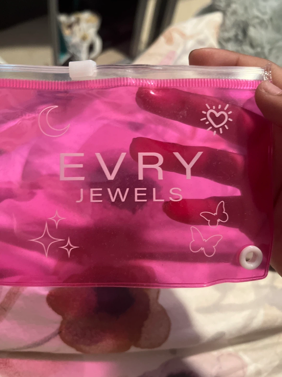 Selling a cute jewelry bag from EVRY JEWELS! It's a pink, translucent bag with a zipper closure and little white details. Perfect for storing your favourite pieces