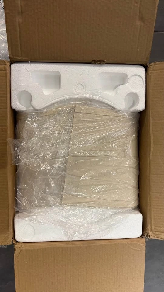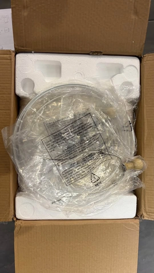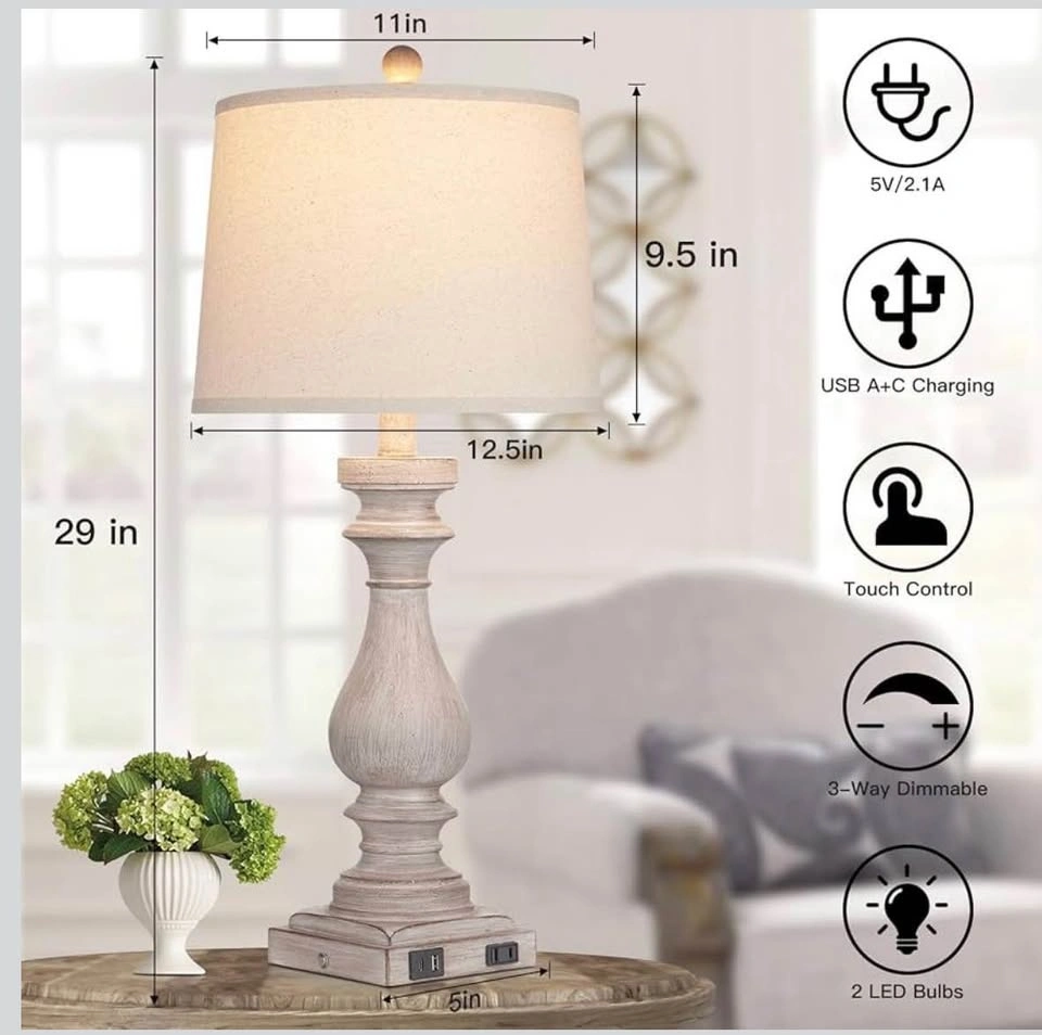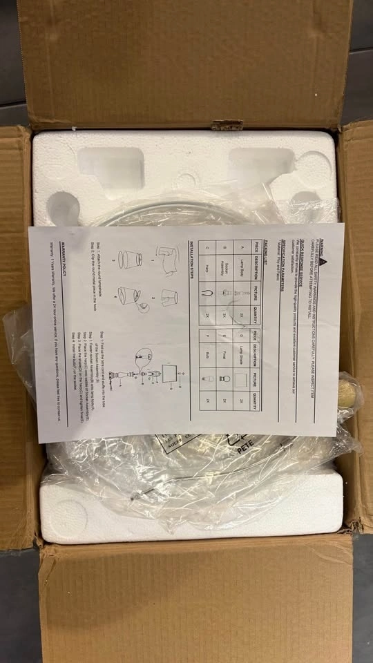 Brand new table lamps in box. Each lamp has a beige fabric shade, lamp body, socket assembly, harp, and finial. Instructions are included for easy setup. All parts are still wrapped in original packaging.