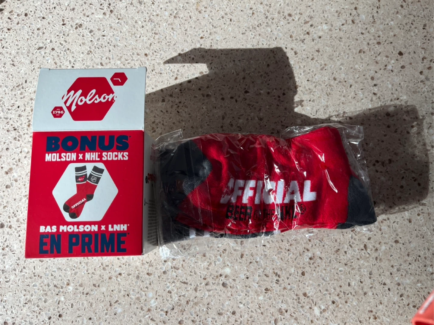 Selling a pair Molson x NHL socks! These are brand new and still in the packaging. Perfect for any hockey fan or Molson enthusiast
