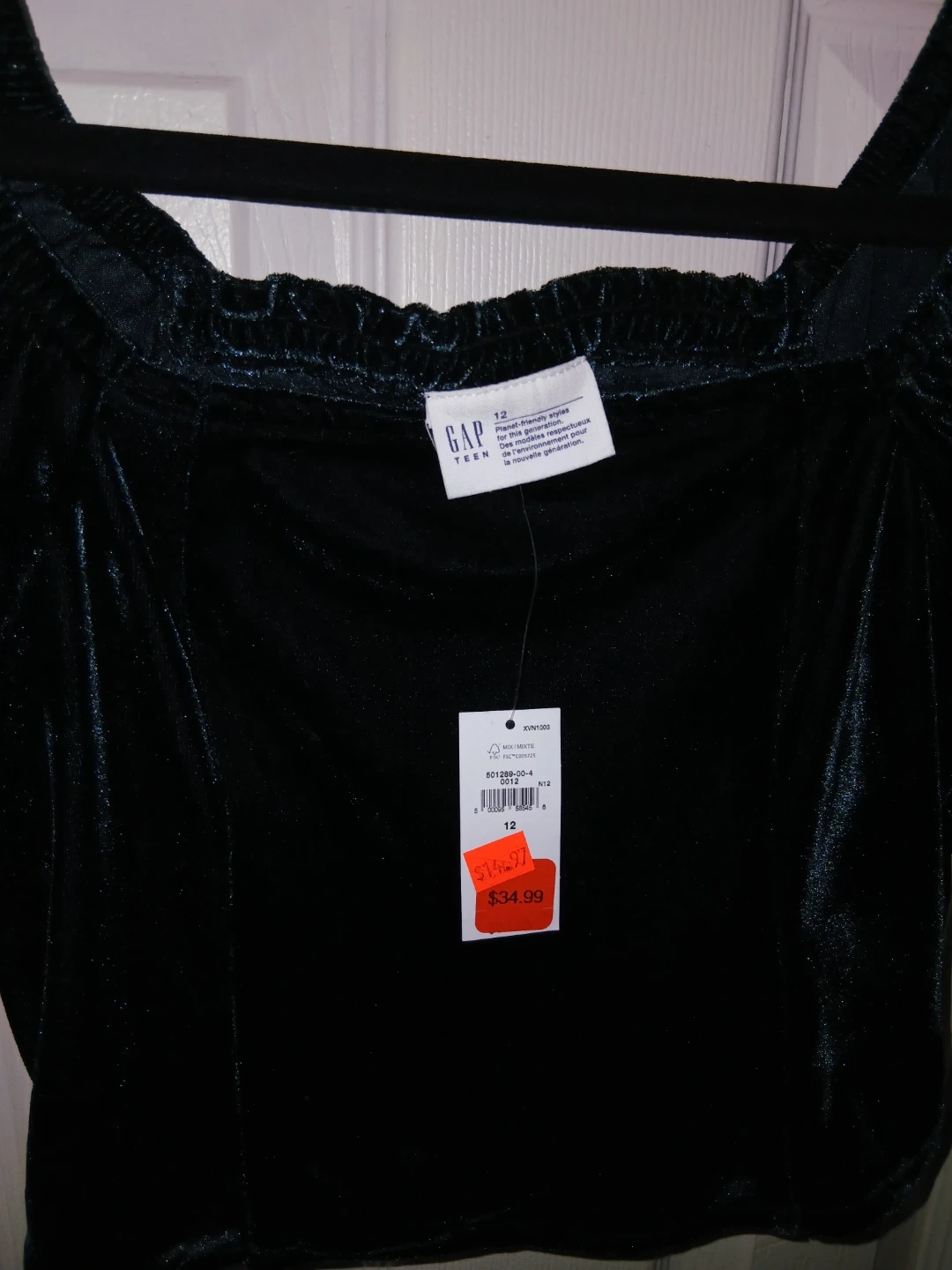This dark green velvet crop top from GAP Teen. It has puff sleeves and a square neckline & can also be worn off shoulder. It's a size 12, NWT.