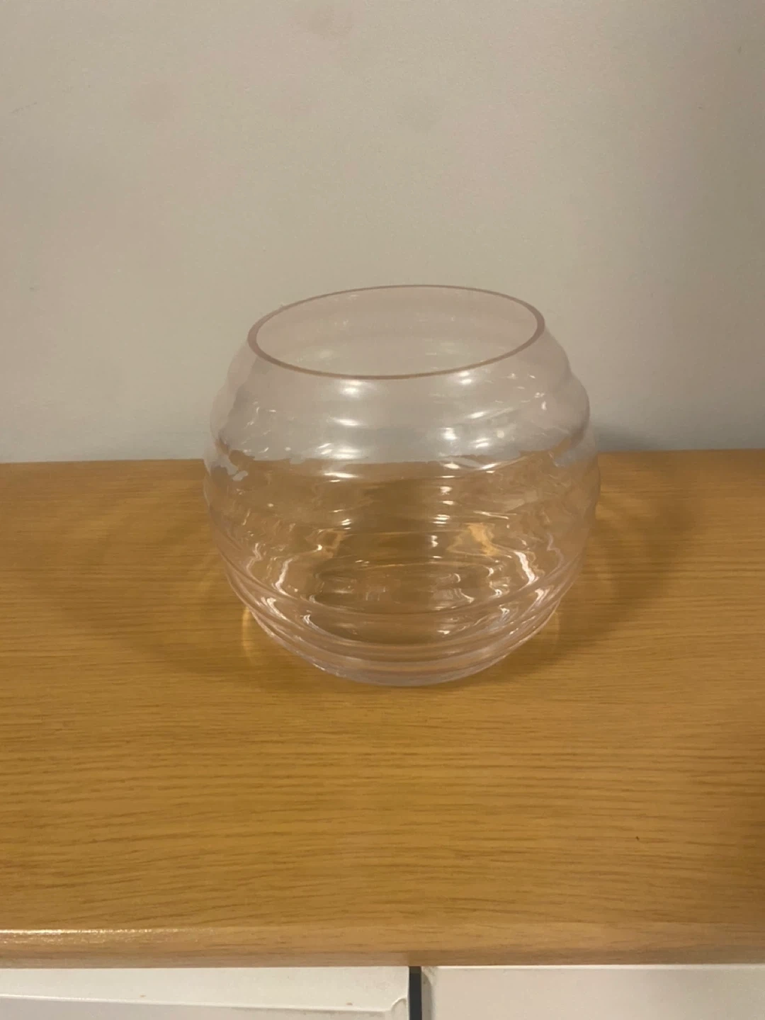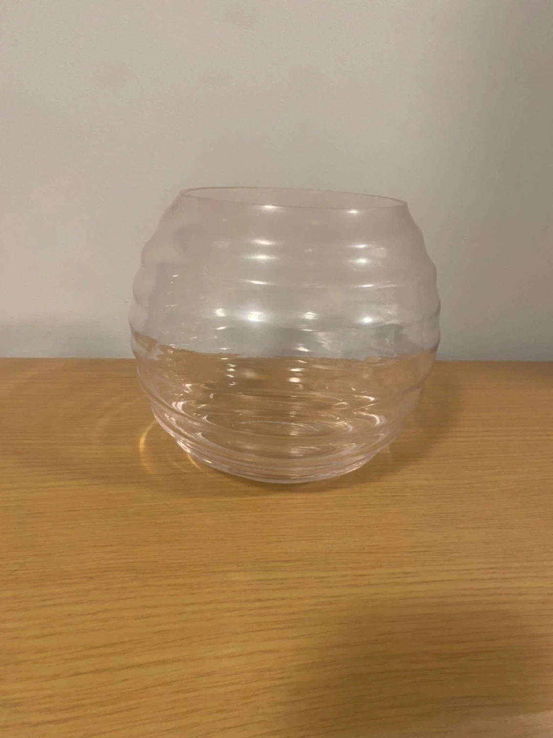 This clear glass vase has a unique ribbed texture around its body. It's perfect for displaying flowers or as a decorative accent piece. Glass material.