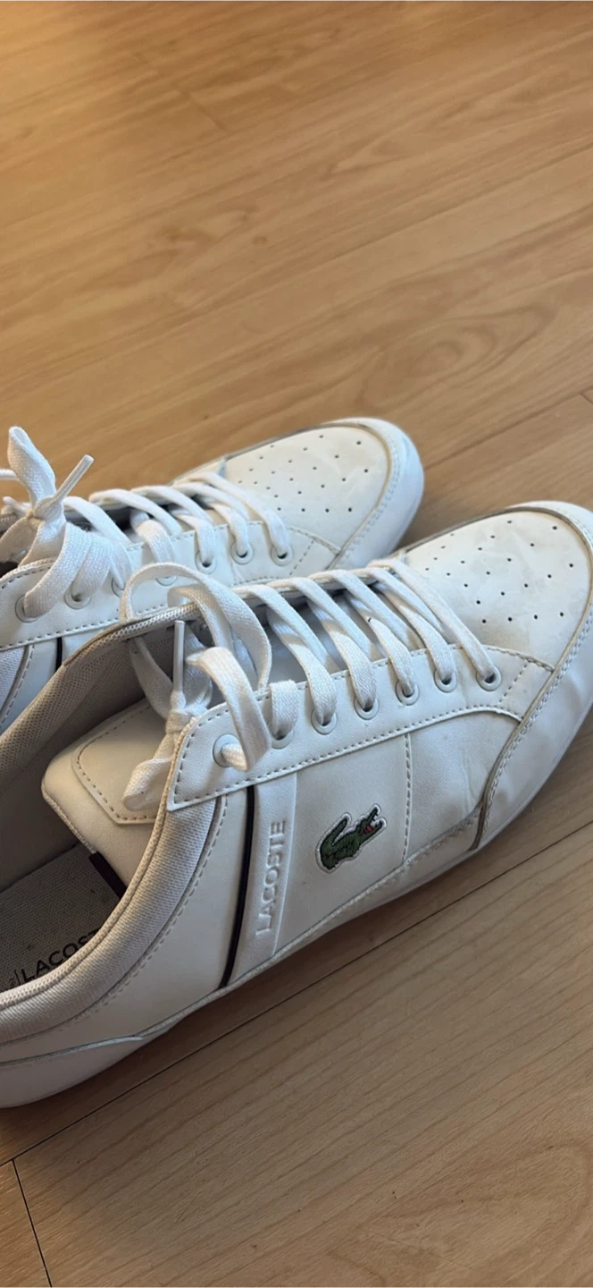 White leather sneakers from Lacoste. Features a classic design with side logo detailing and lace-up closure. These are stylish and comfortable for everyday wear.