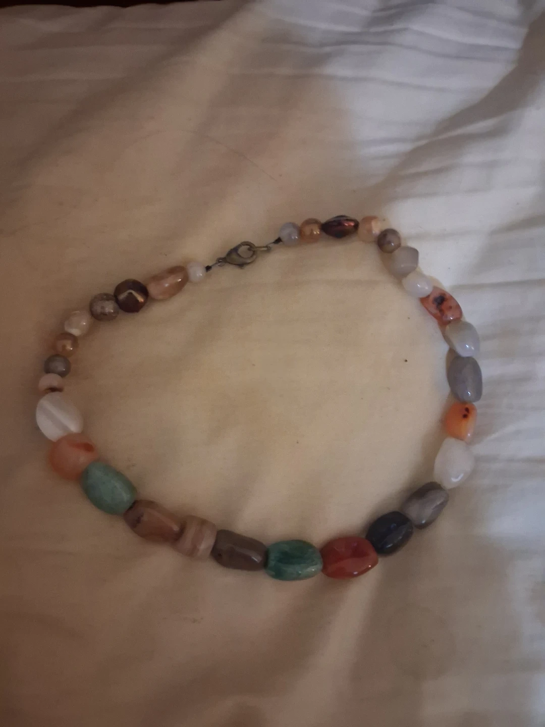 Here's a colorful beaded necklace! It features a variety of stone-like beads in different colors and shapes. It's a unique and eye-catching piece to add to your jewelry collection
