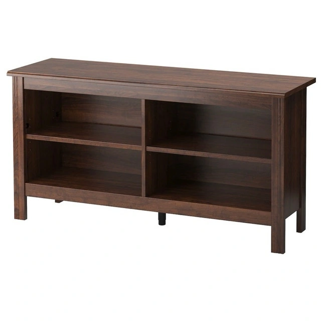 This is a used TV stand with a wood-grain finish, perfect for supporting your television and storing media devices or décor. It features open shelving for easy access and cord management options. There are some minor signs of wear, but it remains sturdy and functional. Dimensions: 48 inches wide, 24 inches high, 16 inches deep. Material: Manufactured wood. Colour: Dark brown. Cash accepted.