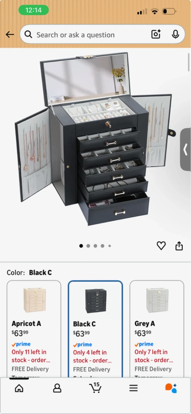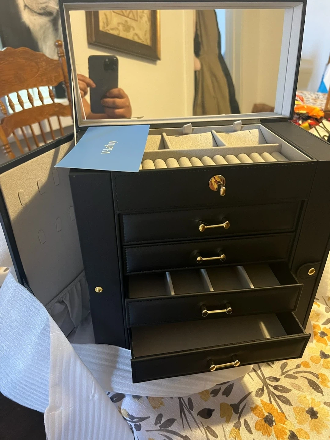 This spacious jewelry box features multiple drawers and compartments for all your accessories. It's designed with a built-in mirror and a secure lock. Black faux leather exterior. Dimensions: 12" L x 7.5" W x 9.5" H.