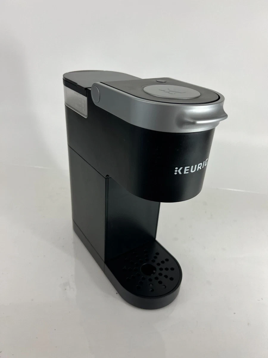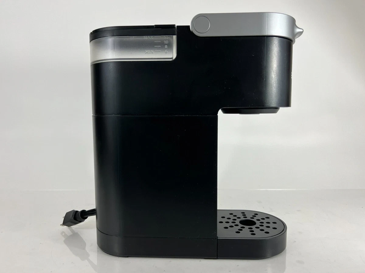 This black Keurig K-Mini coffee maker brews single cups of coffee. It has a water reservoir with markings for minimum and maximum fill levels. The K-Mini is designed for countertop use.
