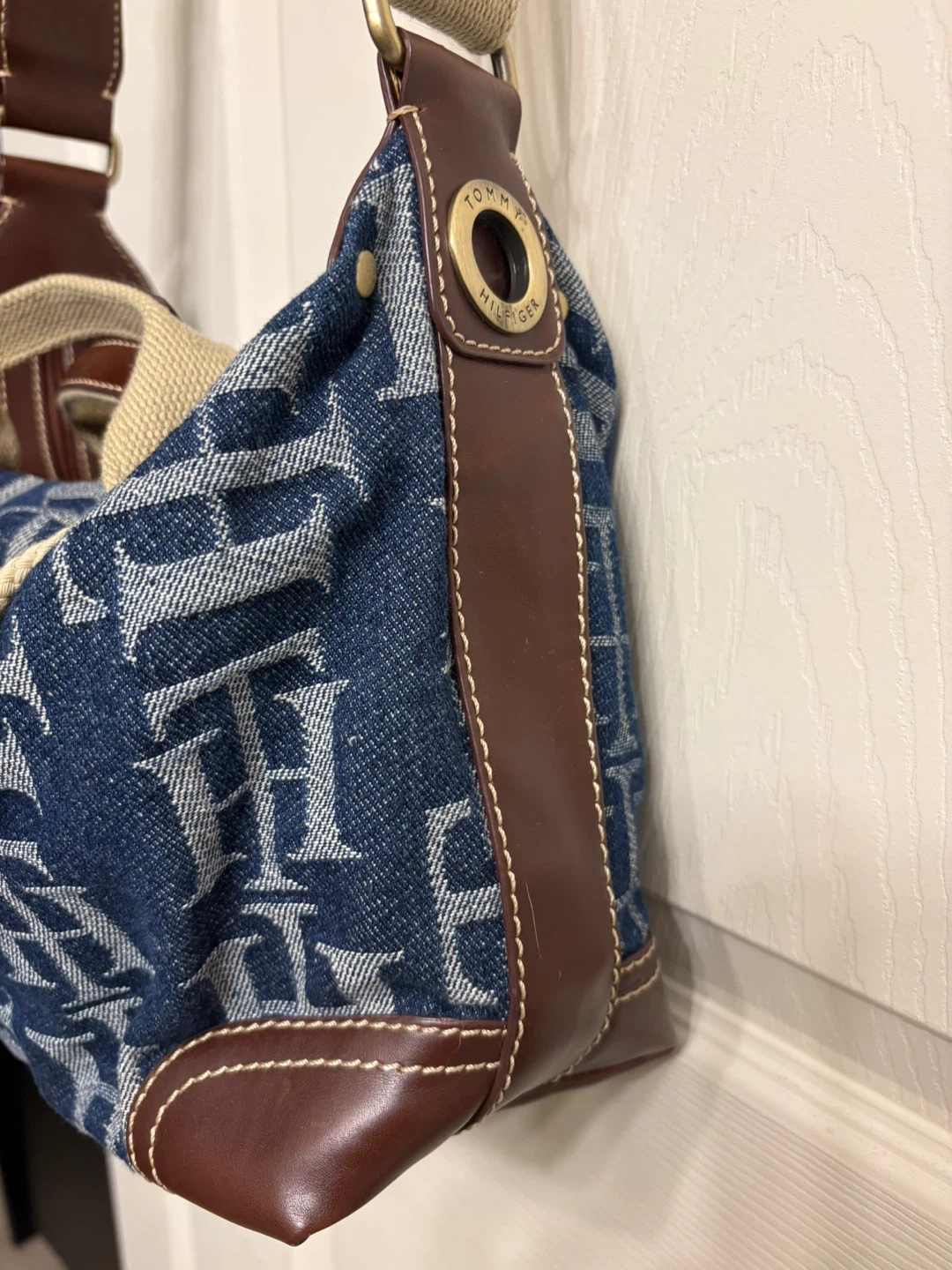 This Tommy Hilfiger shoulder bag features a denim exterior with the TH monogram print. It has brown faux leather trim and strap details. It's a stylish everyday bag. This beautiful bag is in perfect condition! Pick up in Chestermere.
