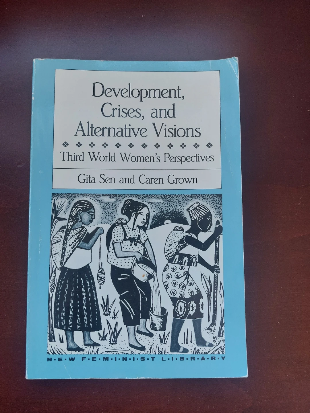 This book is titled Development, Crises, and Alternative Visions, featuring Third World Women's Perspectives. It's written by Gita Sen and Caren Grown. The book is part of the New Feminist Library series.
