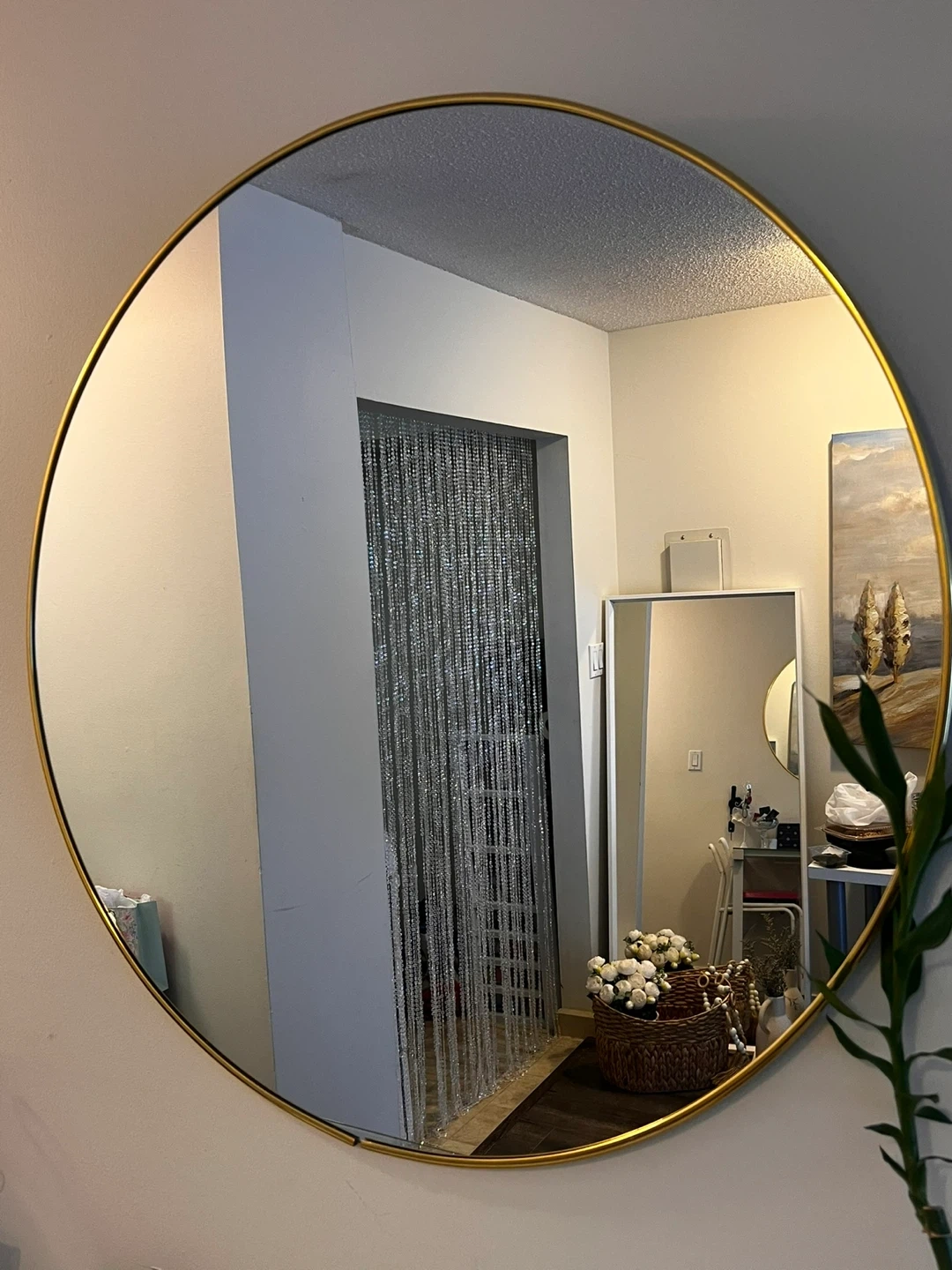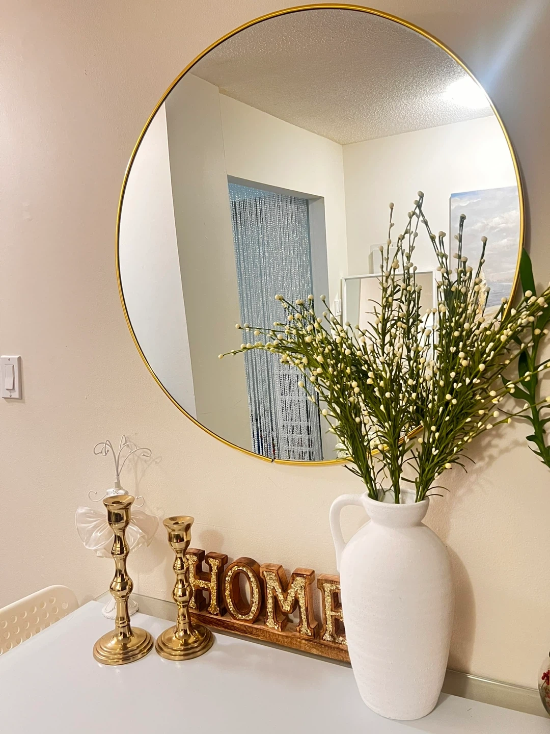 This is a stylish round wall mirror with a thin gold metal frame. It's perfect for adding a touch of modern elegance to any room. The mirror's generous size makes it a great focal point for your entryway or living space.