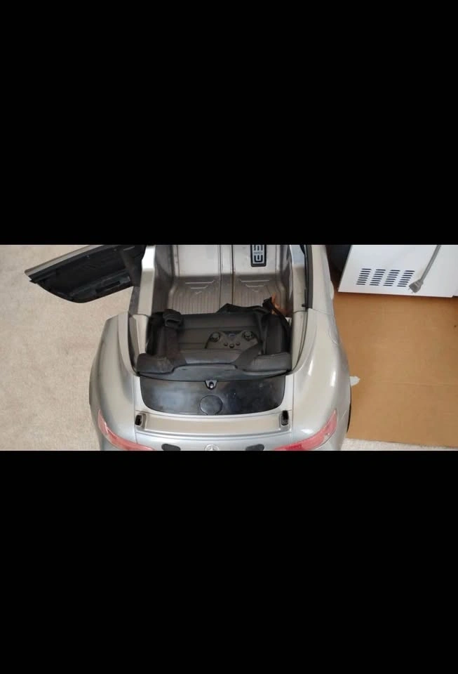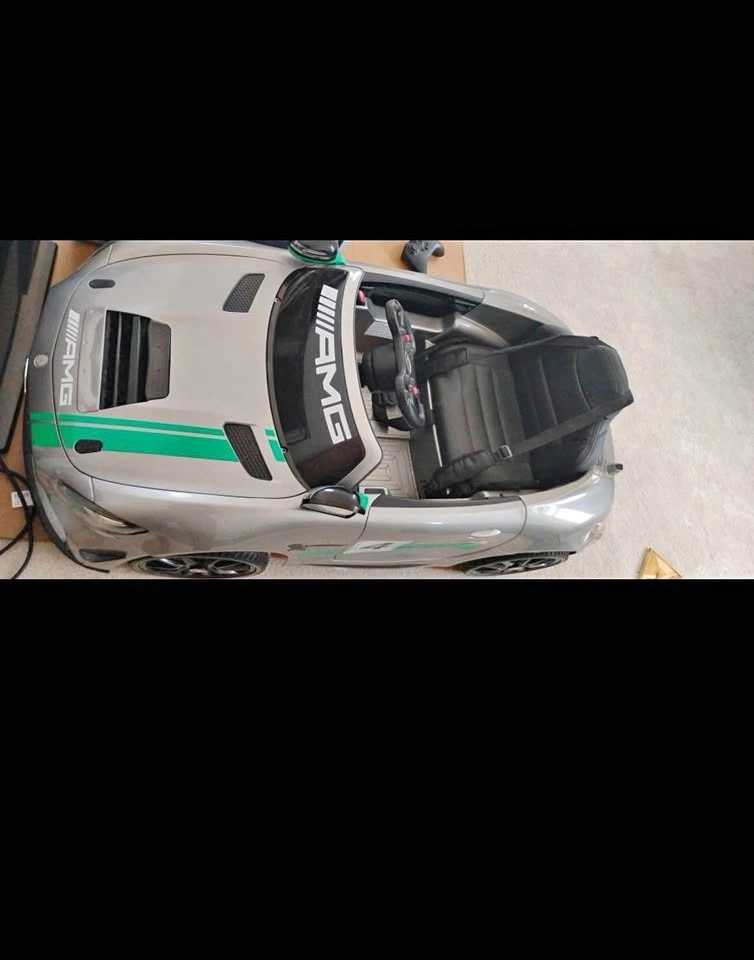 Awesome electric ride on car for kids. This Mercedes-Benz AMG GT has a cool silver and green design. It features a working steering wheel with the Mercedes logo, a seatbelt for safety, and doors that open. Charger is not included.