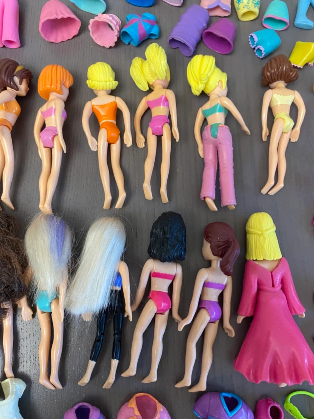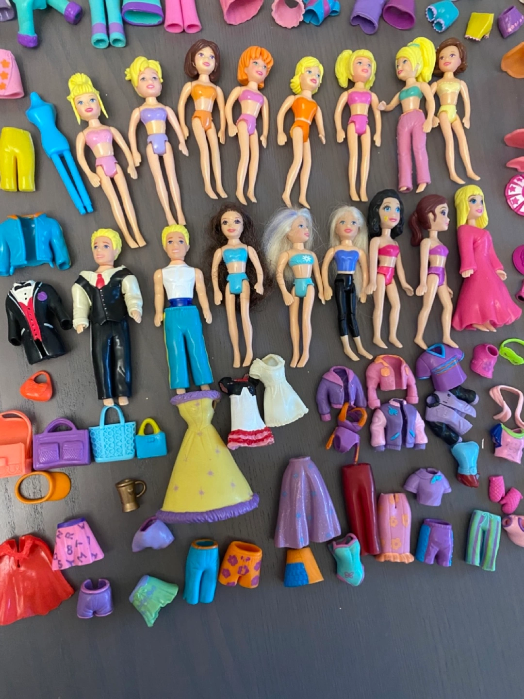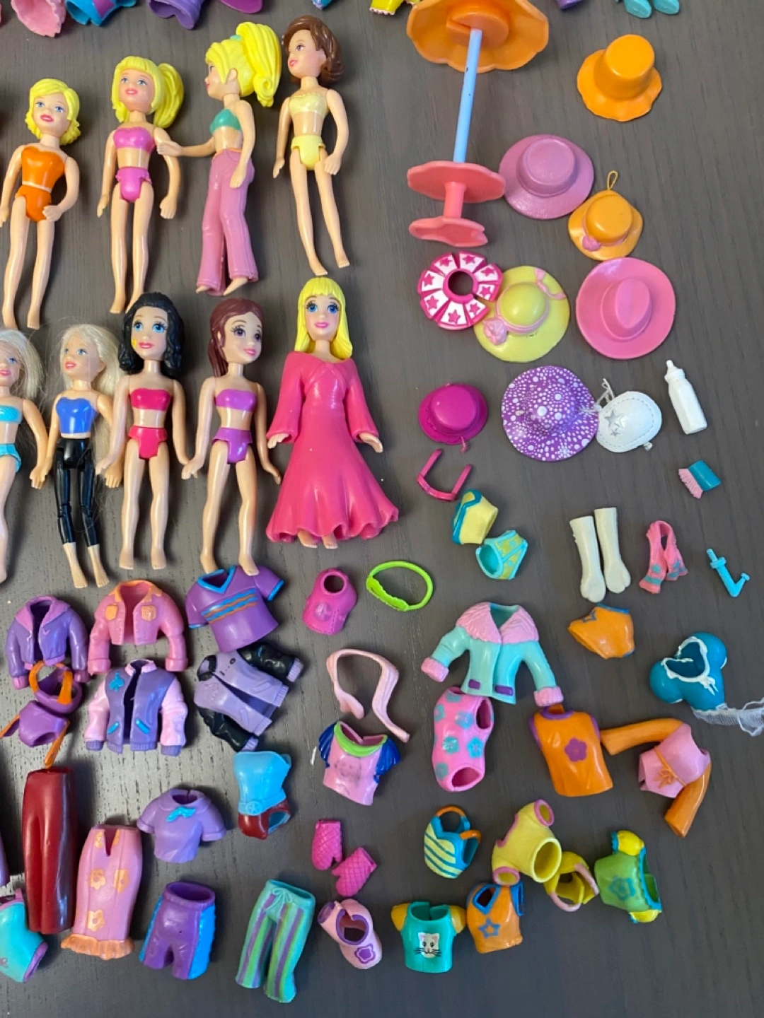 Rare find! This is a large lot of Polly Pocket dolls and clothing accessories. It includes multiple dolls, outfits, shoes, and hats. Everything is pre-owned and ready for new adventures!