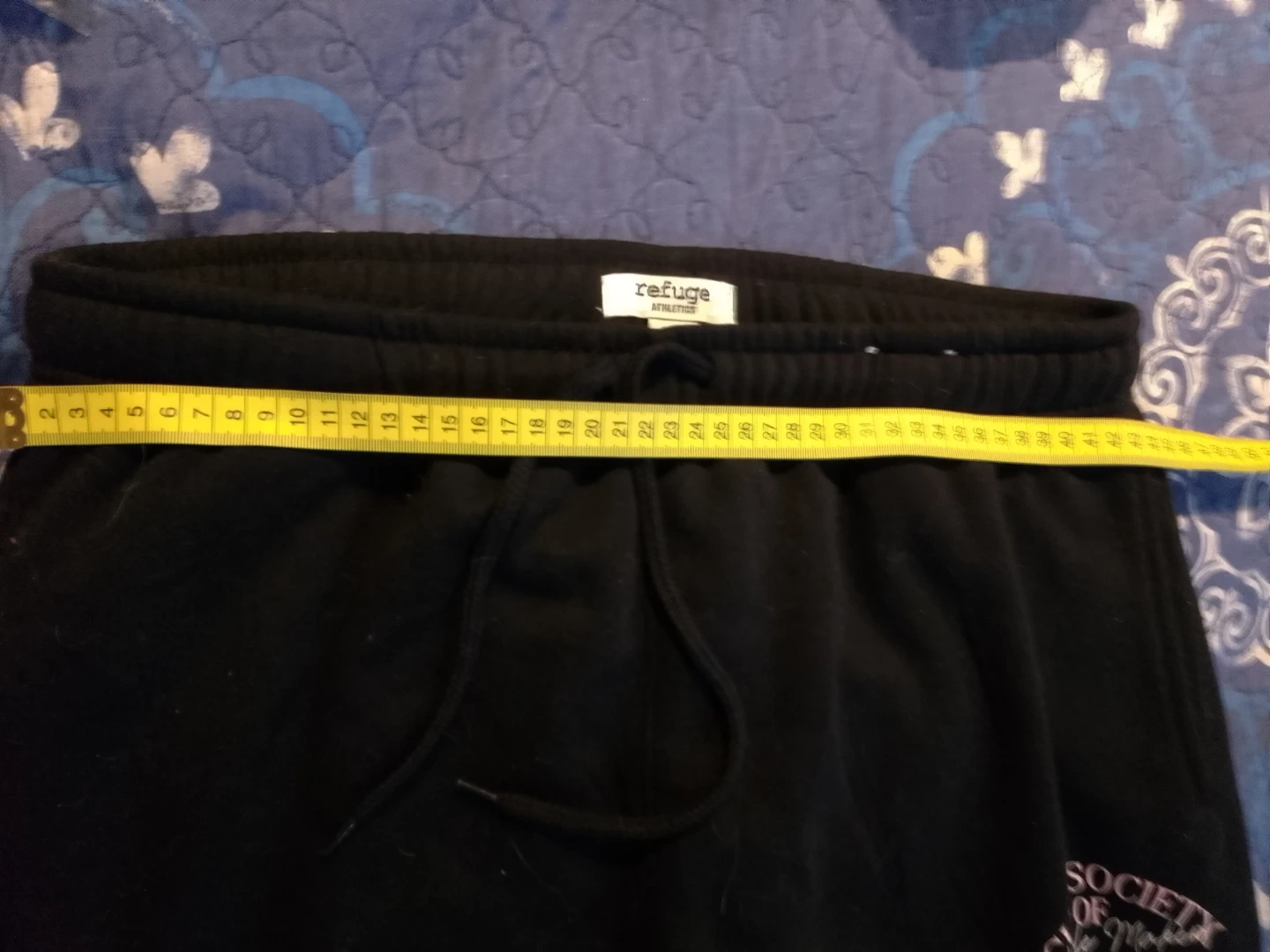 Black sweatpants from Refuge Athletics. They're comfy and great for lounging or casual wear. Elastic waistband with drawstring closure. The exact measurements are provided in the slides.