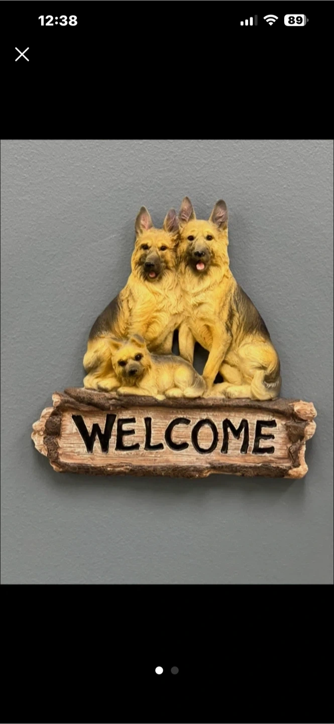 Cute wall decor featuring a German Shepherd family and a "WELCOME" sign. It's made from durable material and comes with a hanger for easy mounting. Perfect for adding a warm touch to your entryway!